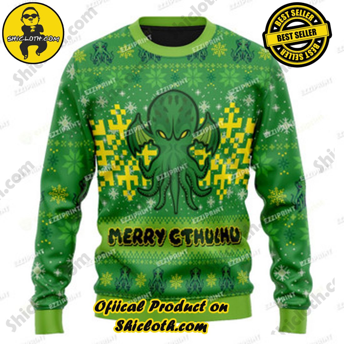 Introducing the Merry Cthulhu Ugly Christmas Sweater – the perfect blend of holiday spirit and Lovecraftian charm. This unique sweater is not your ordinary Christmas sweater; it combines the joyous festivities of the season with the mysterious allure of the ancient cosmic entity, Cthulhu. Imagine the delight of owning this one-of-a-kind garment, showcasing your love for all things weird and wonderful. The Merry Cthulhu Ugly Christmas Sweater is intricately designed, featuring a festive pattern adorned with images of Cthulhu himself, alongside whimsical holiday elements like snowflakes, reindeer, and Christmas trees. It’s a true conversation starter, ensuring all eyes will be on you at any outing, whether it be a festive gathering, a casual get-together with friends, or even in your everyday work life. Just picture the smiling faces and curious glances as you confidently rock this sweater, asserting your unique taste and love for the unconventional. Furthermore, its high-quality materials guarantee both comfort and durability, making it suitable for daily wear throughout the holiday season. So, embrace the extraordinary and make a statement this Christmas with the Merry Cthulhu Ugly Christmas Sweater – a wonderful addition to any festive wardrobe that will surely make you the talk of the town.