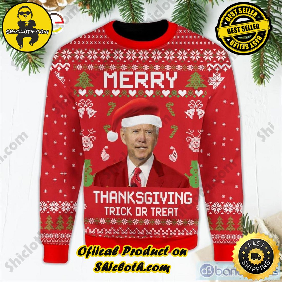 Merry Thanksgiving Trick or Treat Pullover Funny Santa Biden Red Ugly Christmas Sweater