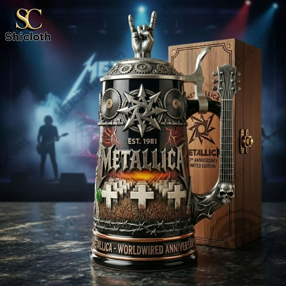 This beer stein features an incredibly detailed 3D relief that captures the essence of the band’s history. The body is wrapped in a dark, atmospheric finish showcasing the classic Master of Puppets-style crosses rising from a field, while the Metallica logo sits boldly at the center. One of the most unique features is the guitar-shaped handle, complete with a fretboard and a small skull at the base, providing a solid and comfortable grip. The lid is topped with a silver-toned “Rock On” hand gesture finial, and the base is ringed with realistic barbed wire textures and “Worldwired Anniversary” text. Every inch of this stein is crafted from premium-quality glass and durable resin, ensuring it remains scratch-resistant even with frequent use.