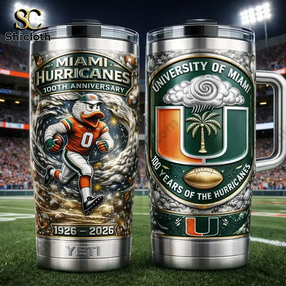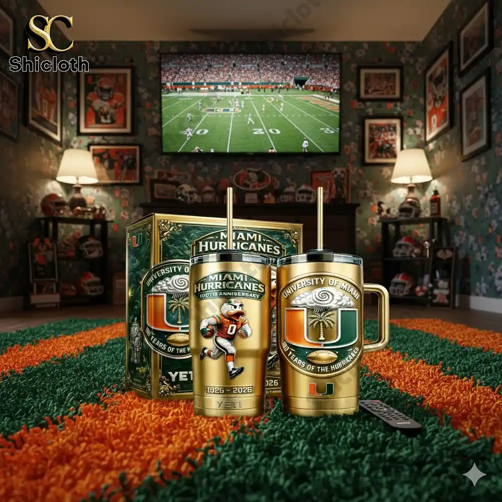 To celebrate a century of excellence, the Miami Hurricanes 100th Anniversary Limited Edition YETI Tumbler captures the spirit of “The U” in a stunning commemorative design. Available in both a sleek metallic silver and a premium gold finish, this collection features two distinct styles: a classic tapered tumbler and a sturdy handled mug. Both versions are adorned with the iconic running Sebastian the Ibis mascot, wearing jersey number 0, set against a swirling hurricane backdrop. The design includes the official “U” logo with a palm tree and hurricane cloud, the dates 1926–2026, and “100 Years of the Hurricanes” wrapped around a golden football detail. These tumblers are crafted from high-quality inox stainless steel with a double-wall insulated construction, ensuring your drinks stay icy cold during hot Florida tailgates or perfectly warm during those rare chilly game nights.