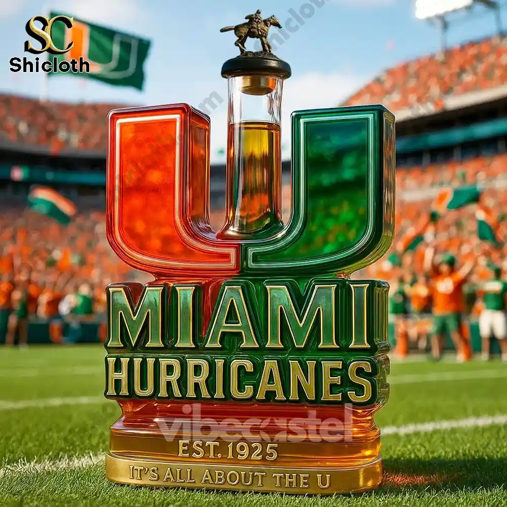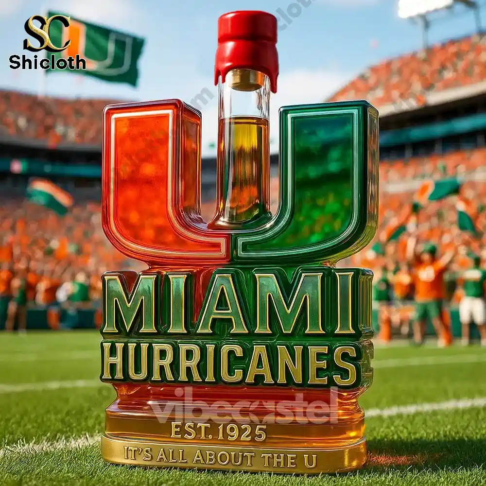 The bottle’s shape is bold and unmistakable: it’s formed by the iconic “U” logo, split right down the middle! One half glows in the classic Miami Orange, and the other half shines in Hurricanes Green. The central vessel for the liquid rises dramatically between the two halves. Below the iconic logo, the words “MIAMI HURRICANES” are powerfully embossed in metallic green and gold. The base of the bottle features the founding year, “EST. 1925,” and the legendary motto: “IT’S ALL ABOUT THE U.” The entire design rests on a striking gold-finished base, adding extra sparkle and stability.