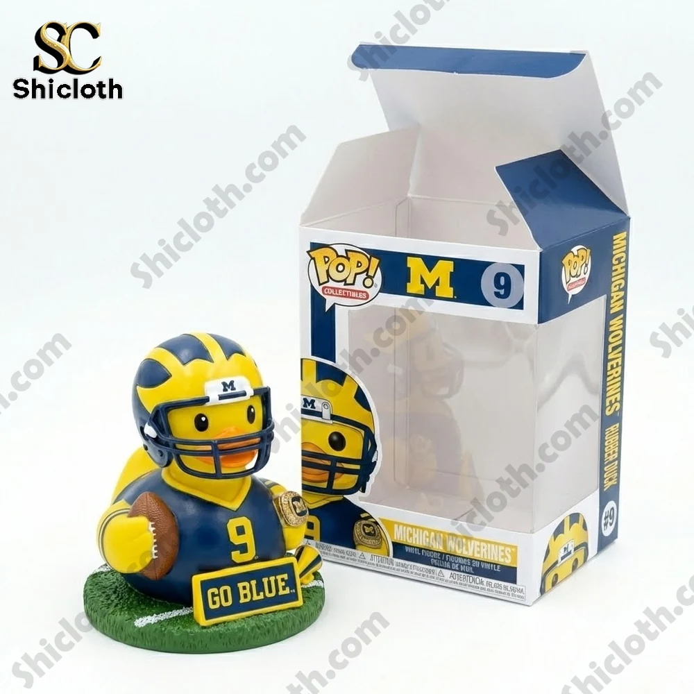 The Michigan Wolverines Go Blue Football Rubber Duck is the ultimate collectible for any die-hard fan looking to bring a bit of the Big House into their home or office. This intricately designed figure features a yellow rubber duck decked out in full Michigan football gear, complete with a winged helmet, a navy blue jersey, and a tiny football tucked under its wing. It even comes with a personalized touch, showcasing the name “CORUM” and number 9 on the back, making it a perfect tribute to a legendary player. Whether you are displaying it in its custom “POP! Collectibles” window box or setting it on your desk, this duck is a standout piece of fan gear.