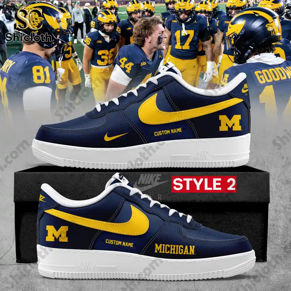 Style 2 (Solid AF1): Offers a deep navy blue upper, providing a more solid and classic look. The yellow Nike Swoosh, the “M” logo on the heel, and the “MICHIGAN” text on the midsole all stand out brilliantly. Like Style 1, it includes a “CUSTOM NAME” field for personalization, sitting just above the midsole.