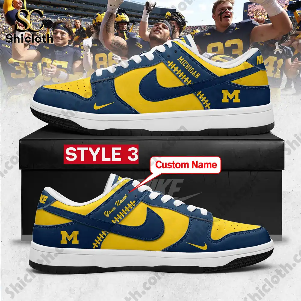 Style 3 (Dunk Style): A low-top shoe featuring a dynamic mix of yellow on the toe box and side panels, contrasted by navy blue overlays and a chunky zipper pattern detail. The “M” logo is on the side heel, and “MICHIGAN” is written near the laces. This style also includes a Custom Name option on the heel tab.