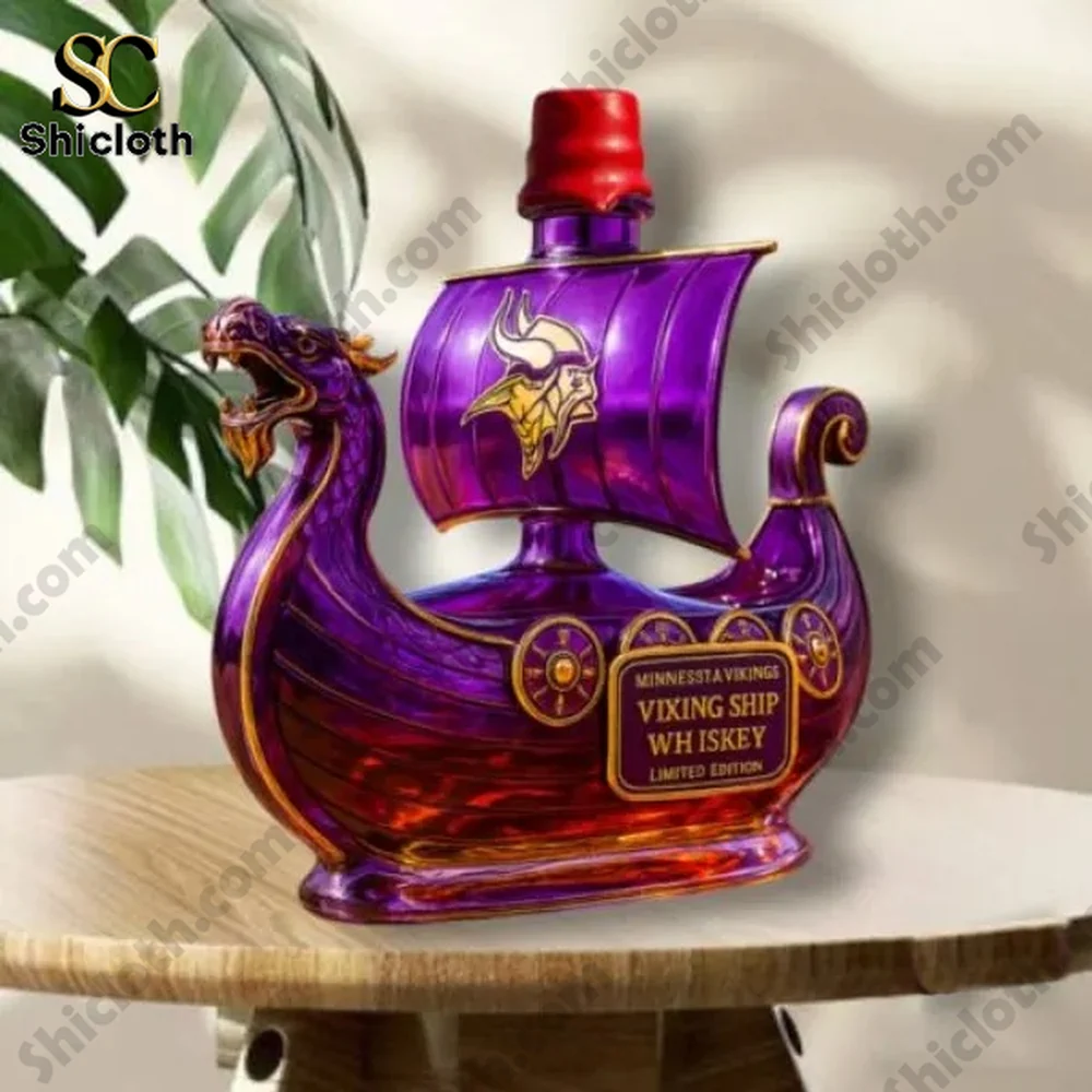 The design is nothing short of legendary! The entire longship is finished in the Vikings’ iconic colors: a dazzling, metallic Purple and Gold, with a stunning fiery Red-Orange gradient across the bottom hull, giving the illusion of a setting sun or a ship at sea. The bow of the ship features a fierce dragon’s head, intricately detailed with a gleaming gold finish. The ship’s sail boldly displays the official Minnesota Vikings helmet logo, a universal symbol of power and tradition. The hull is decorated with shields in the Vikings’ colors, and a central plaque reads “Minnesota Vikings Christmas Whiskey Bottle.”