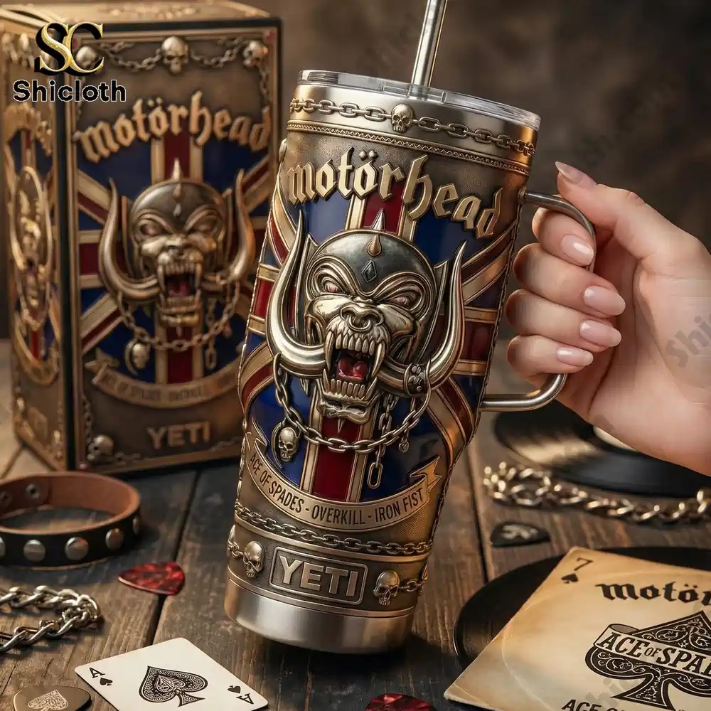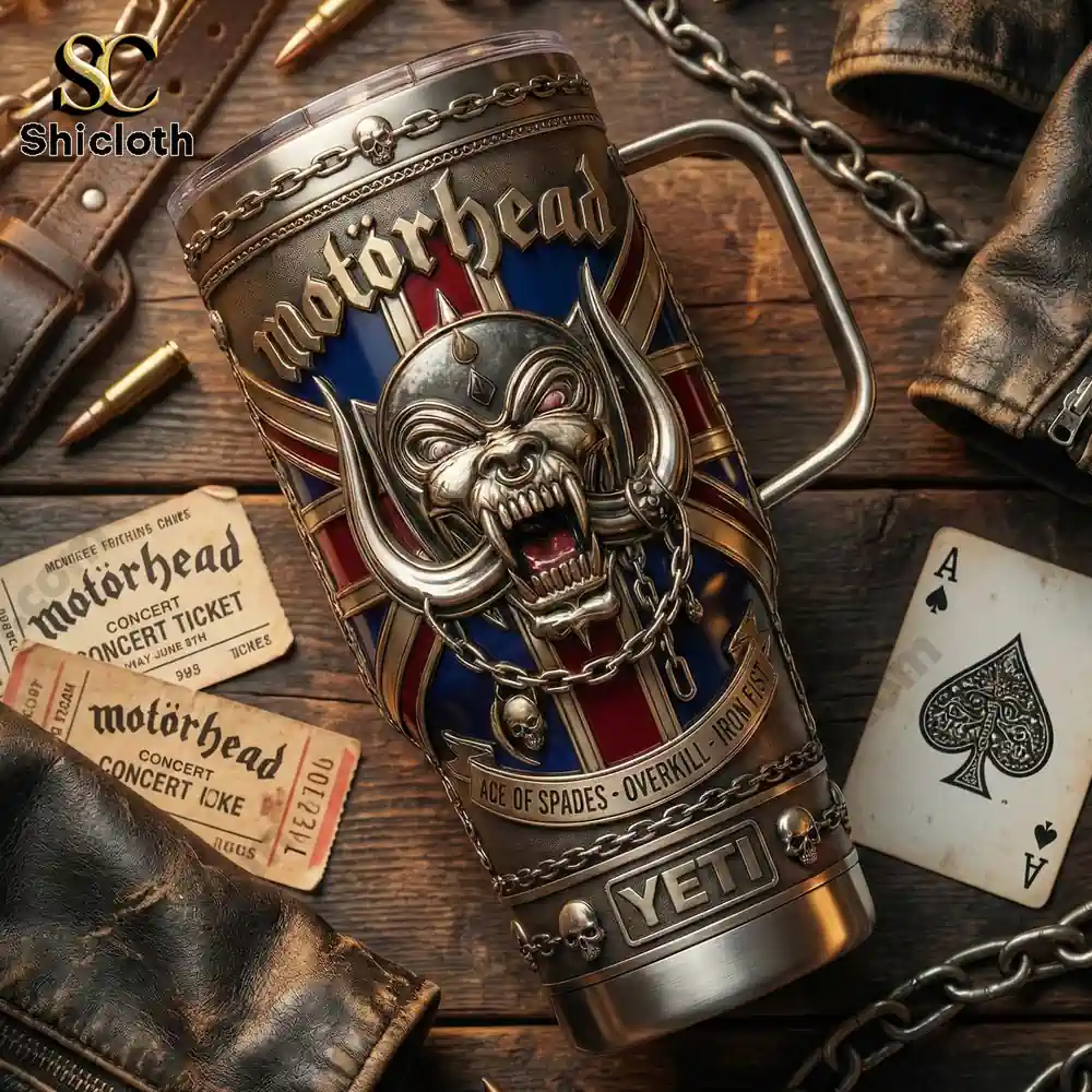 The Motorhead Ace of Spades YETI Tumbler is a premium piece of drinkware that blends heavy metal aesthetics with top-tier insulation technology. This rugged tumbler features a 3D-sculpted design of the iconic War-Pig (Snaggletooth) mascot set against a Union Jack backdrop, finished in a distressed metallic bronze and silver patina. The exterior is highly detailed, showcasing raised chains, skulls, and a commemorative ribbon listing classic tracks like Overkill and Iron Fist. Crafted from high-quality inox stainless steel, it utilizes a double-wall vacuum seal to keep your beverages icy cold during summer beach trips or steaming hot during winter commutes.