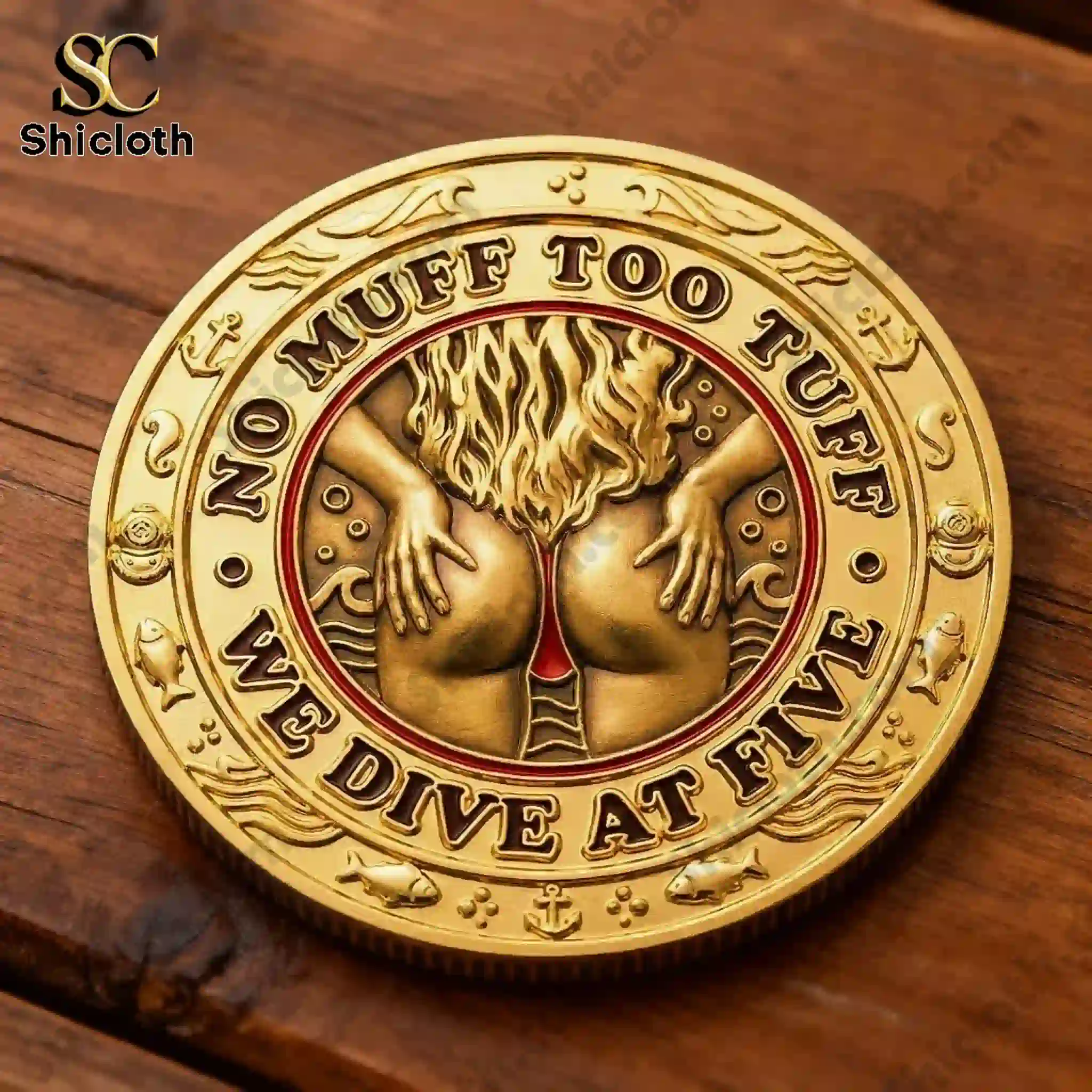 This 1.25-inch coin features intricate 3D detailing that brings its cheeky theme to life. The front side showcases a vintage diving helmet positioned between a pair of raised legs, set against a vibrant sunset-striped background of orange, yellow, and red. You will notice small, embossed details like swimming fish and coral reefs flanking the central image, along with the text “Muff Diving School Since ’69” and the slogan “Learn To Discover The Mystery That Lies Beneath.” The reverse side is equally detailed, featuring a textured golden backside of a figure with the playful phrase “No Muff Too Tuff – We Dive At Five” encircling the rim, accented by tiny anchor and nautical symbols.