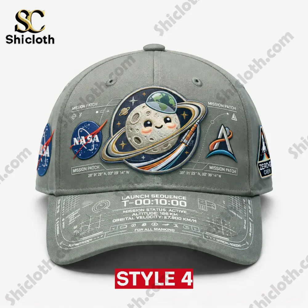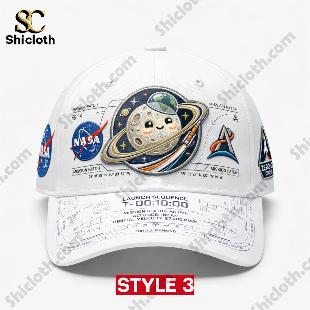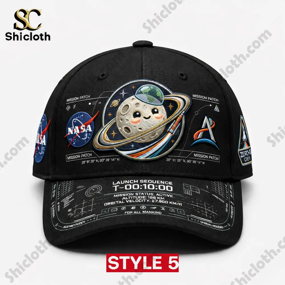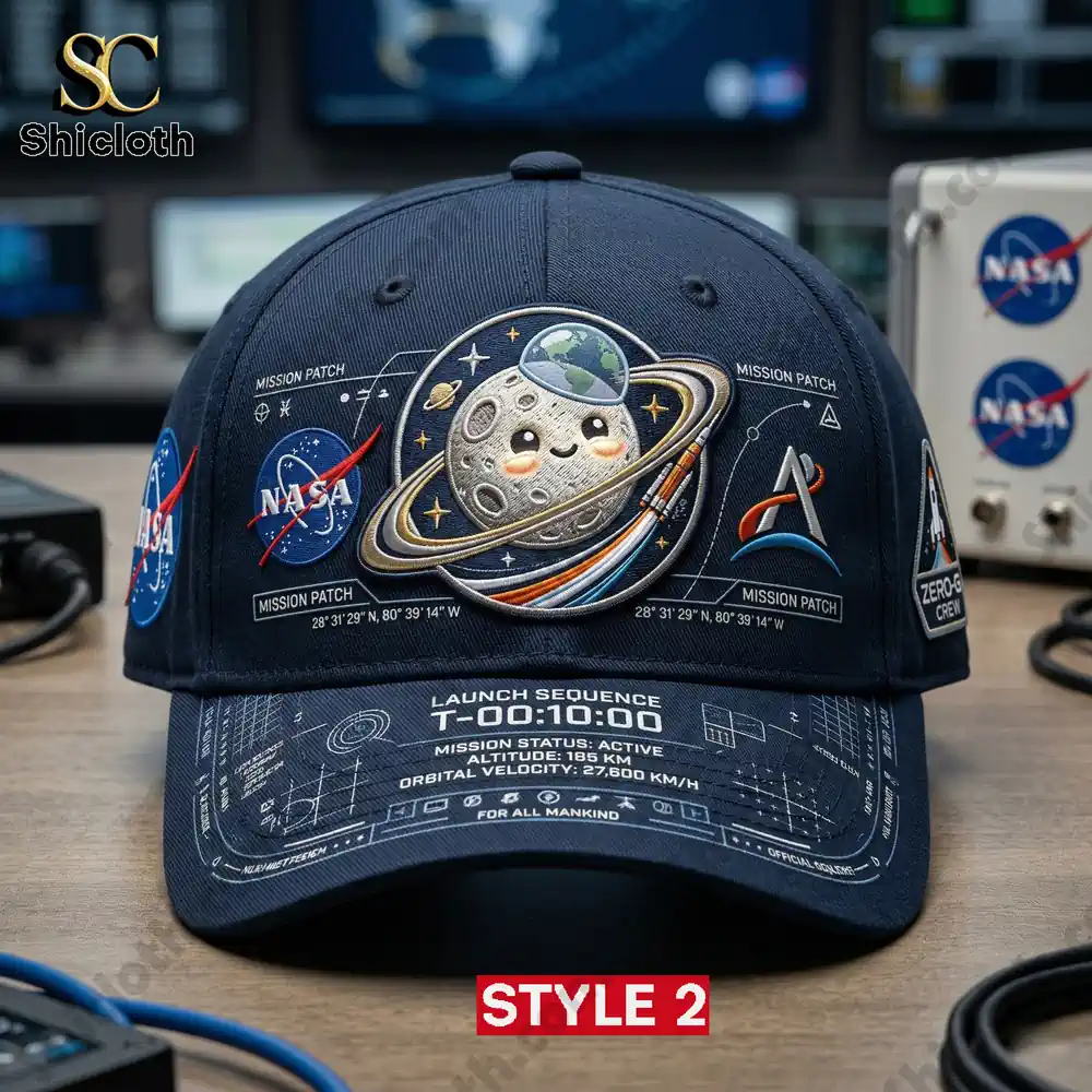 Style 1 is just the beginning of the journey. If tie-dye isn’t your universe, we offer five distinct styles to choose from. Style 2 takes all the same intricate patches and technical details but sets them against a deep, contrasting navy blue base, making the 3D moon and logos truly pop with a sophisticated, professional edge. For a more understated yet equally detailed look, check out Style 4, which features the same mission elements and adorable 3D moon on a smooth, subtle grey cotton twill. No matter which style you choose, you’re getting the same high-quality construction and stunningly precise details that celebrate your passion for space in a fun, conversational way.