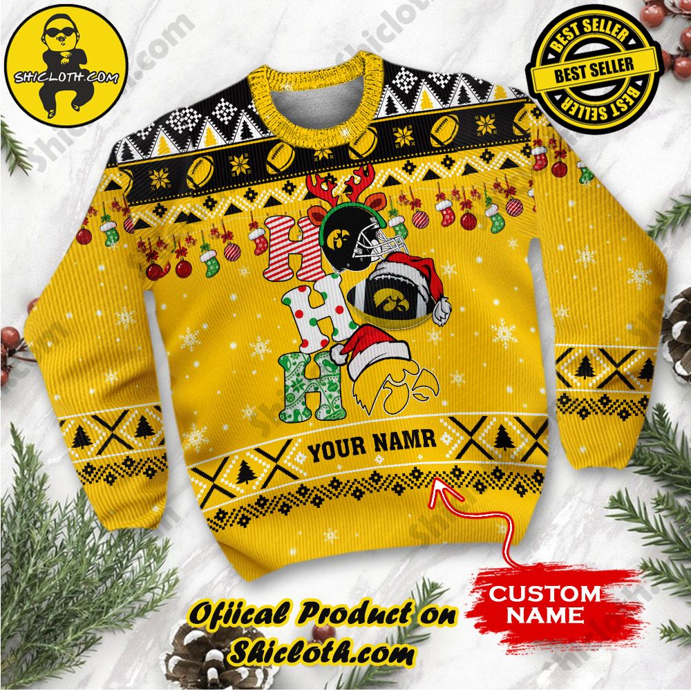 KEY FEATURES: NCAA Iowa Hawkeyes Ho Ho Ho Custom Name Ugly Christmasl Sweater