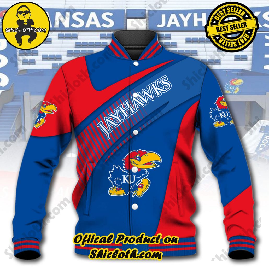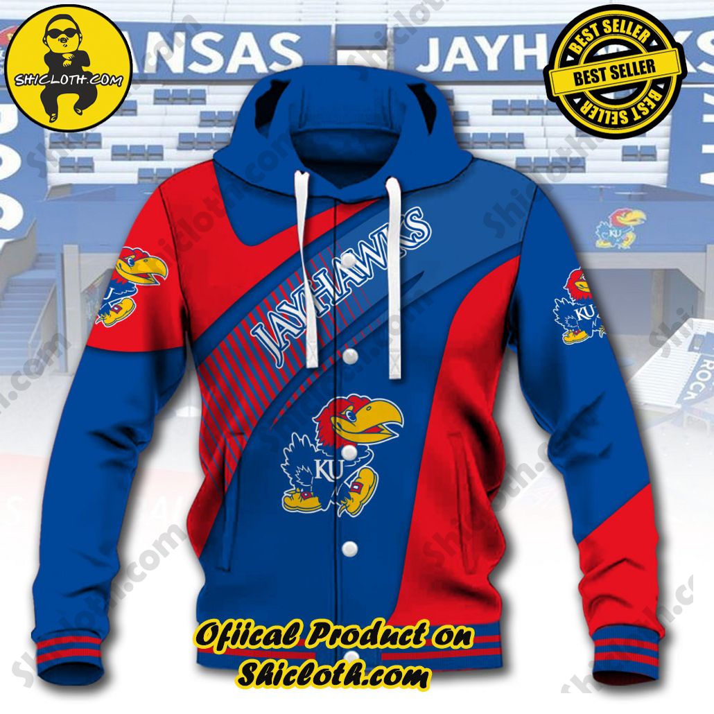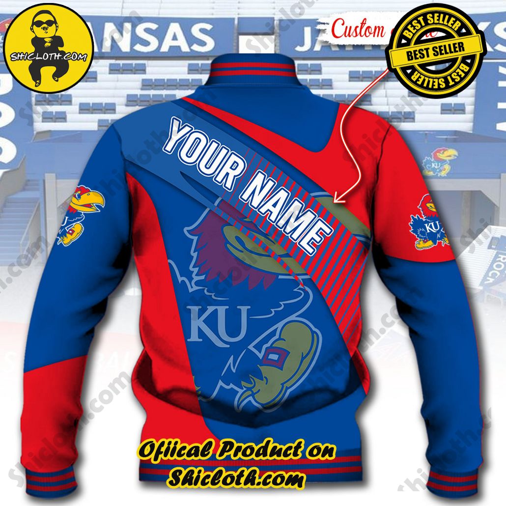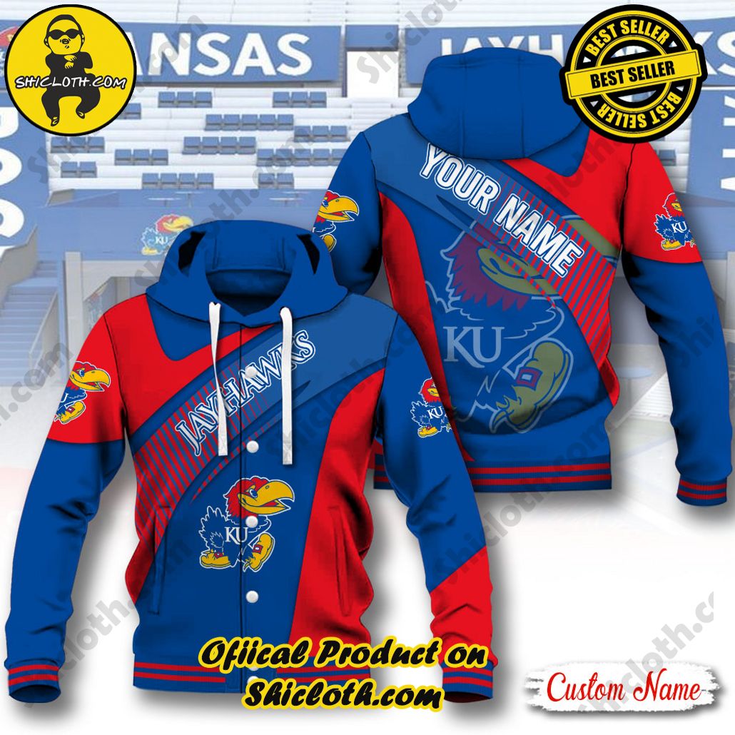 Overview of the NCAA Kansas Jayhawks Custom Name Baseball Jacket Hoodie New Ver: