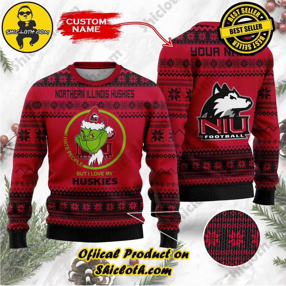 KEY FEATURES: NCAA Northern Illinois Huskies Grinch Custom Name Ugly Christmas Sweater
