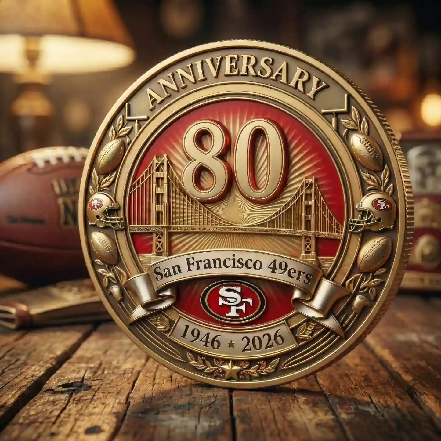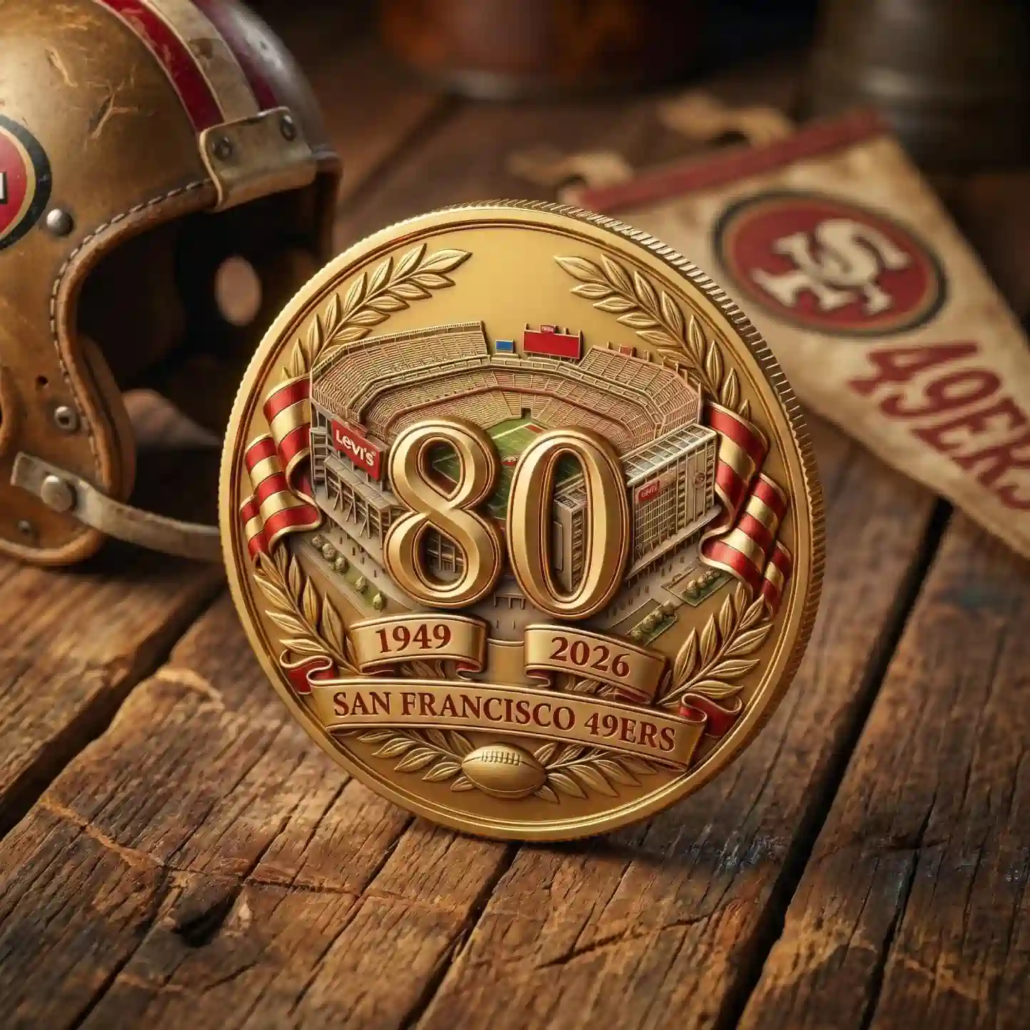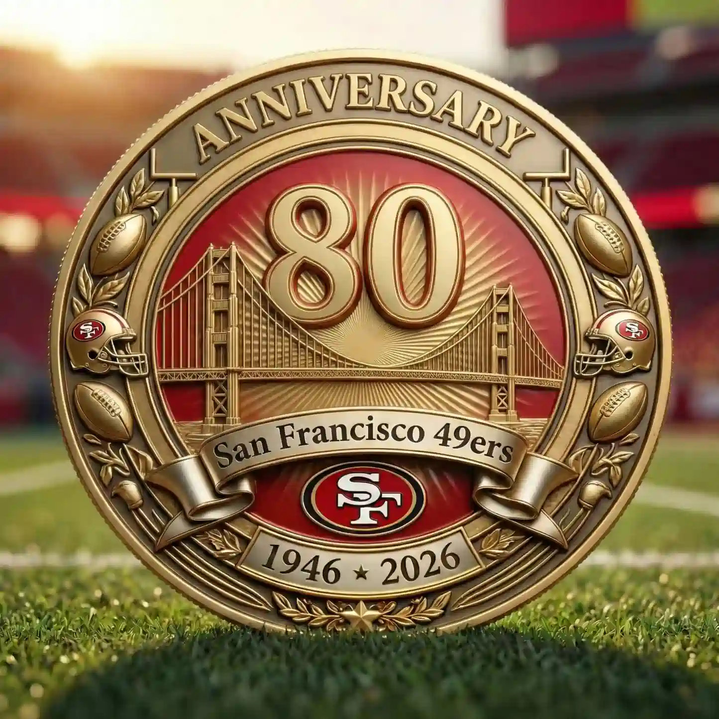 The San Francisco 49ers 80th Anniversary Commemorative Coin is a must-have treasure for the Faithful, marking eight decades of legendary football history. These stunning gold-finished coins come in two distinct styles to celebrate the team’s legacy: one featuring the iconic Golden Gate Bridge against a vibrant red sunburst, and another showcasing a detailed 3D relief of Levi’s Stadium. Both designs prominently display a large, polished 80th-anniversary numeral at the center, flanked by the historical dates 1946–2026 or 1949–2026 on elegant flowing ribbons.