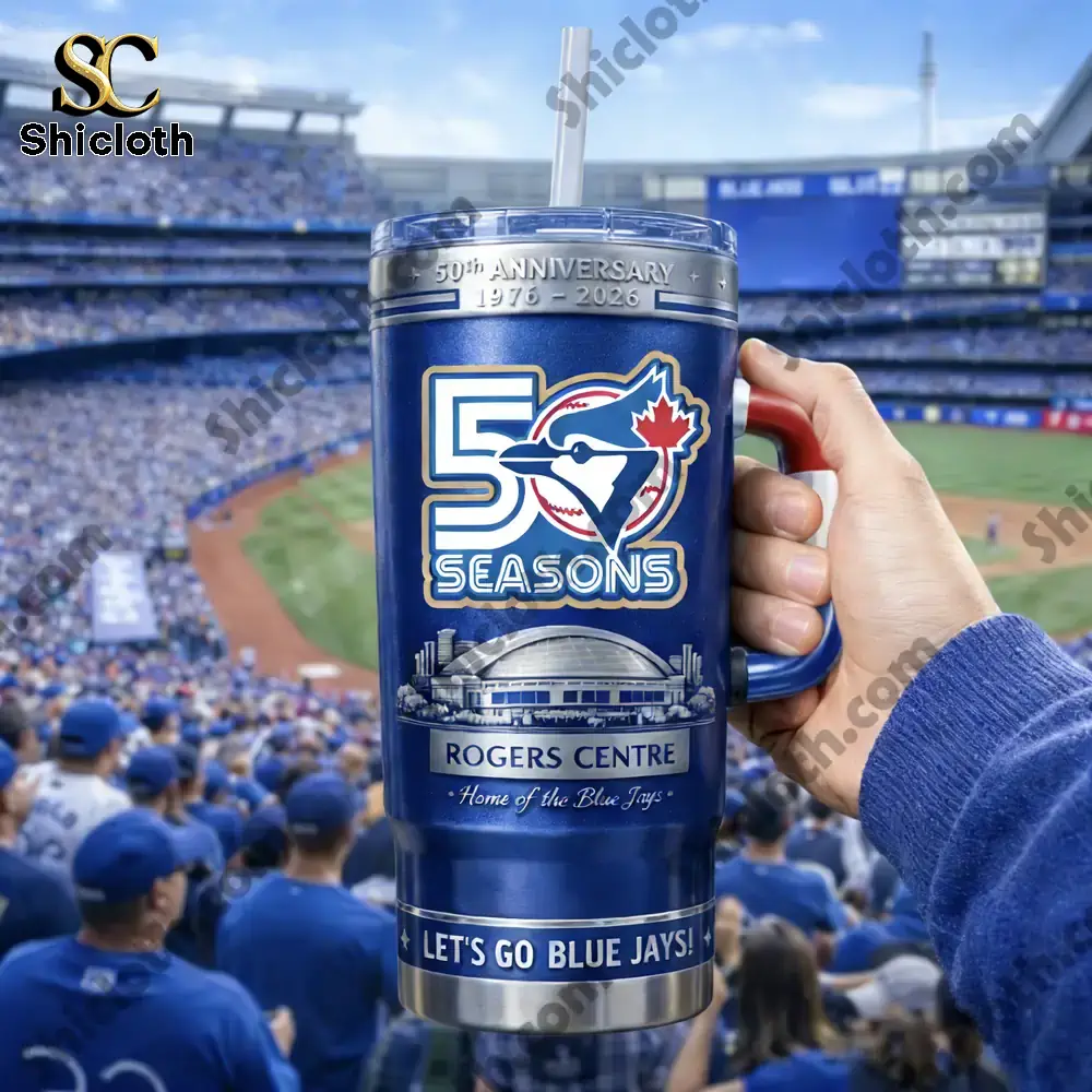 Celebrate a half-century of baseball history with this stunning Toronto Blue Jays 50th Anniversary Tumbler. Designed for the ultimate fan, this commemorative cup features a vibrant royal blue finish and celebrates the team’s journey from 1976 to 2026. The front prominently displays a large “50 Seasons” logo integrated with the iconic Blue Jays bird and maple leaf. Below the logo, you will find a detailed illustration of the Rogers Centre, the “Home of the Blue Jays,” etched beautifully above the motivational “Let’s Go Blue Jays!” slogan at the base. The tumbler is equipped with a unique red, white, and blue ergonomic handle for a secure grip and a clear, splash-proof lid with a reusable straw, making it as functional as it is collectible.