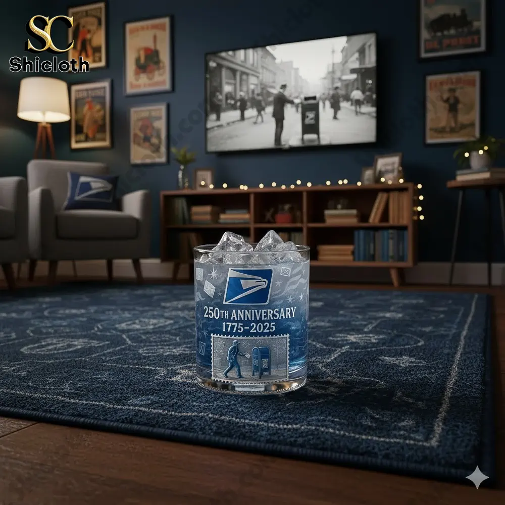 This premium glass features a striking deep blue and frosted silver color palette that wraps around the entire body. At the center, you will find the iconic USPS Eagle logo positioned prominently above the bold text “250TH ANNIVERSARY 1775-2025.” Below this, a detailed vintage postage stamp motif depicts a mail carrier delivering a letter into a classic blue collection box, symbolizing 250 years of service. The background is intricately decorated with subtle envelope patterns, stars, and flowing wave lines, all seamlessly integrated into the design. Crafted from high-clarity glass with a sturdy 11-15oz capacity, this piece feels substantial in the hand, ensuring every sip of your favorite spirit is an experience in itself.