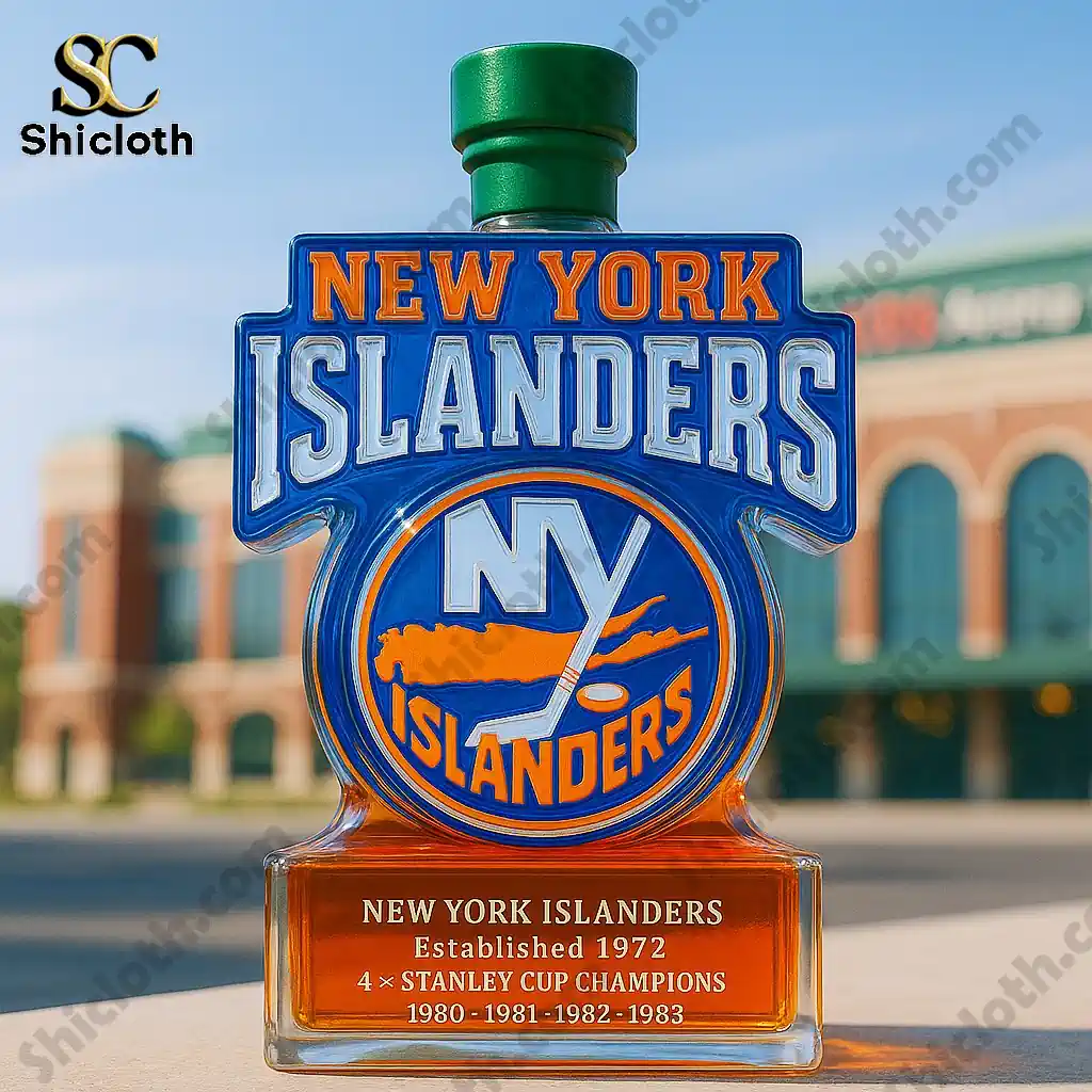 This collector’s item stands out with its high-quality glass material and a vibrant blue and orange finish that showcases the team’s “Established 1972” date and their four consecutive Stanley Cup victories. Each bottle is meticulously detailed with a custom-shape silhouette featuring the classic “NY” hockey stick logo at the center. What makes this collection truly special is the variety of topper options inspired by legendary spirits. You can choose a regal Crown Royal gold crown, a classic Jack Daniel’s black cap, a signature Maker’s Mark red wax-style seal, a Jameson green topper, or the highly coveted Blanton’s horse and jockey figurine. Every detail, from the crisp silver embossed lettering to the sleek, sturdy base, is designed to elevate your home bar or man cave.
