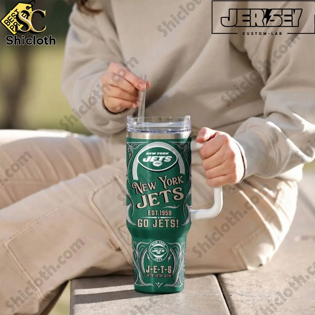 This eye-catching tumbler features a vibrant Gotham Green finish adorned with intricate, silver-toned scrollwork and tribal-style patterns that wrap around the body. The iconic New York Jets oval logo is prominently displayed at the top, while the center features “New York JETS” in a stylized, vintage-inspired font. Just below, you will find the “EST. 1959” mark and the rallying cry “GO JETS!” printed in bold white letters. The base of the cup includes a smaller secondary logo and the famous J-E-T-S chant detailing. To ensure maximum portability, it comes equipped with a sturdy white ergonomic handle and a clear, splash-resistant lid with a reusable straw.