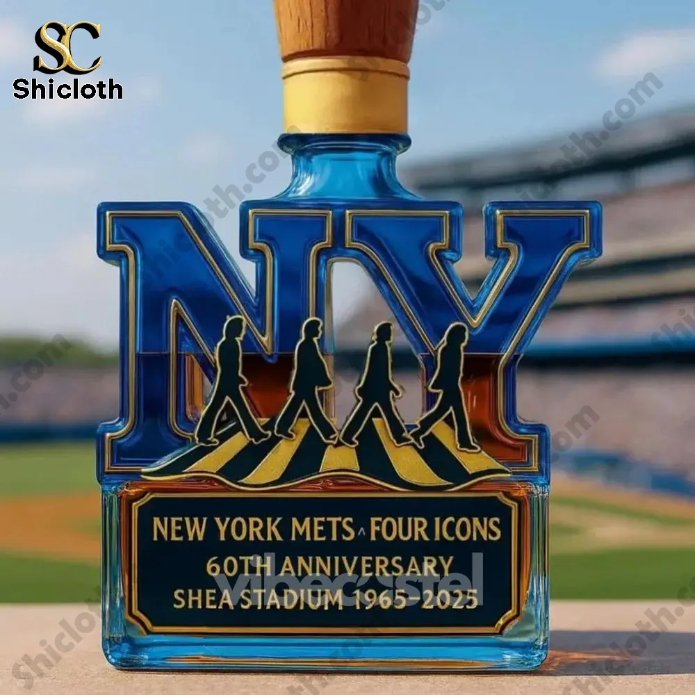 The bottle is shaped like the massive, interlocking “NY” logo, dominating the field of view. The Mets Blue of the letters is accented with a bold Gold trim, making the shape pop against the clear glass. What makes this design truly unique is the legendary cultural reference: centered between the ‘N’ and the ‘Y’ is the silhouette of four figures walking across a crosswalk, famously immortalized by The Beatles on their Abbey Road album cover! This pays homage to The Beatles’ first U.S. stadium concert, held at Shea Stadium in 1965. This clever crossover makes the bottle a multi-layered collector’s dream.