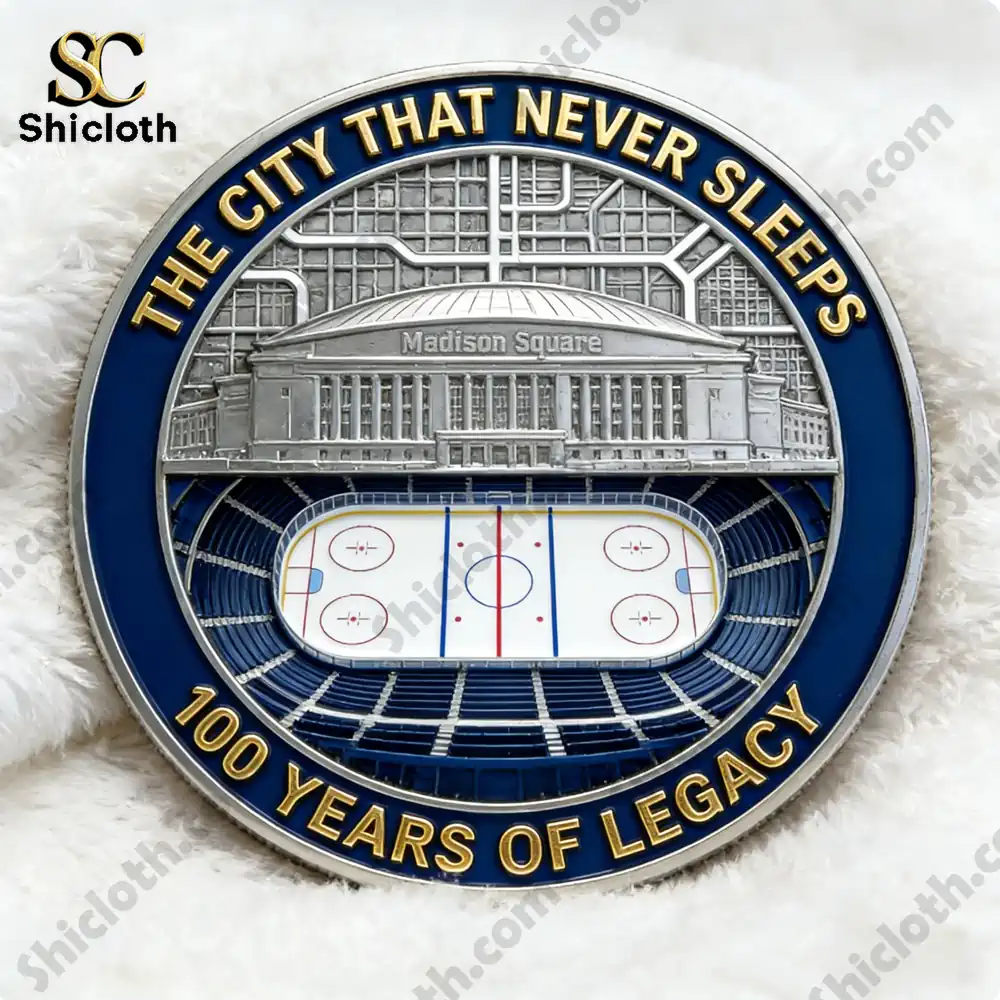 The reverse side of the coin is equally impressive, capturing the essence of “The City That Never Sleeps.” It showcases a highly detailed architectural engraving of the Madison Square Garden exterior, sitting right above an aerial view of a pristine white hockey rink. This side is framed by a deep blue border with the words “100 YEARS OF LEGACY” written in bold gold lettering. Made from high-quality metal, this 1.25-inch coin feels substantial in your hand and boasts a smooth, polished finish that resists tarnishing. To ensure it stays in mint condition, each piece comes with a durable acrylic protective case, allowing you to admire the intricate artwork from both sides without touching the metal surface directly.