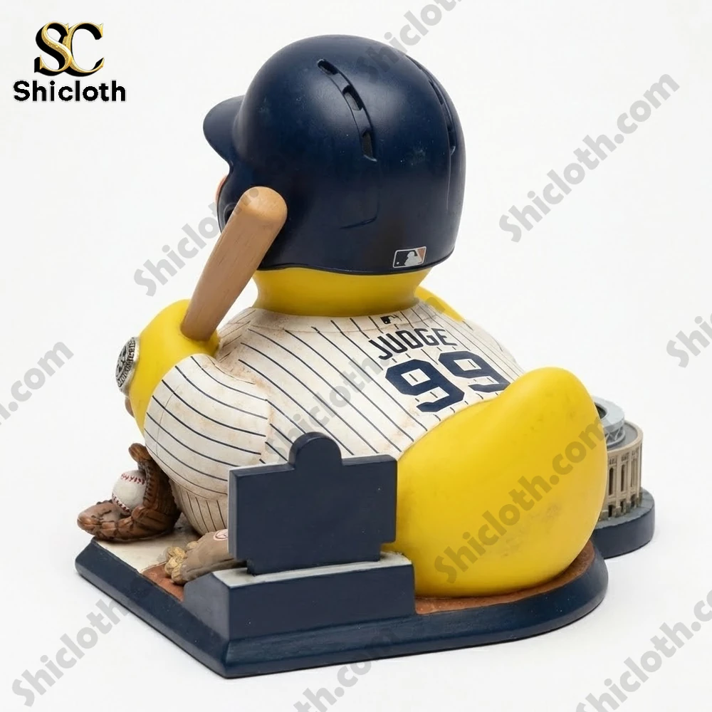 The figurine showcases a yellow duck decked out in a classic navy blue batting helmet and a white pinstripe jersey featuring the legendary number 99. Every detail is meticulously placed, from the wooden bat tucked under its wing to the miniature World Series championship ring prominently displayed on its hand. The duck sits on a custom home-plate base, flanked by a tiny replica of Yankee Stadium, a classic scoreboard, a catcher’s mitt with a baseball, and even a small bag of peanuts. These intricate elements are rendered with sharp dye-sublimation printing, ensuring that even the smallest textures, like the wood grain on the bat or the stitching on the ball, are crystal clear.