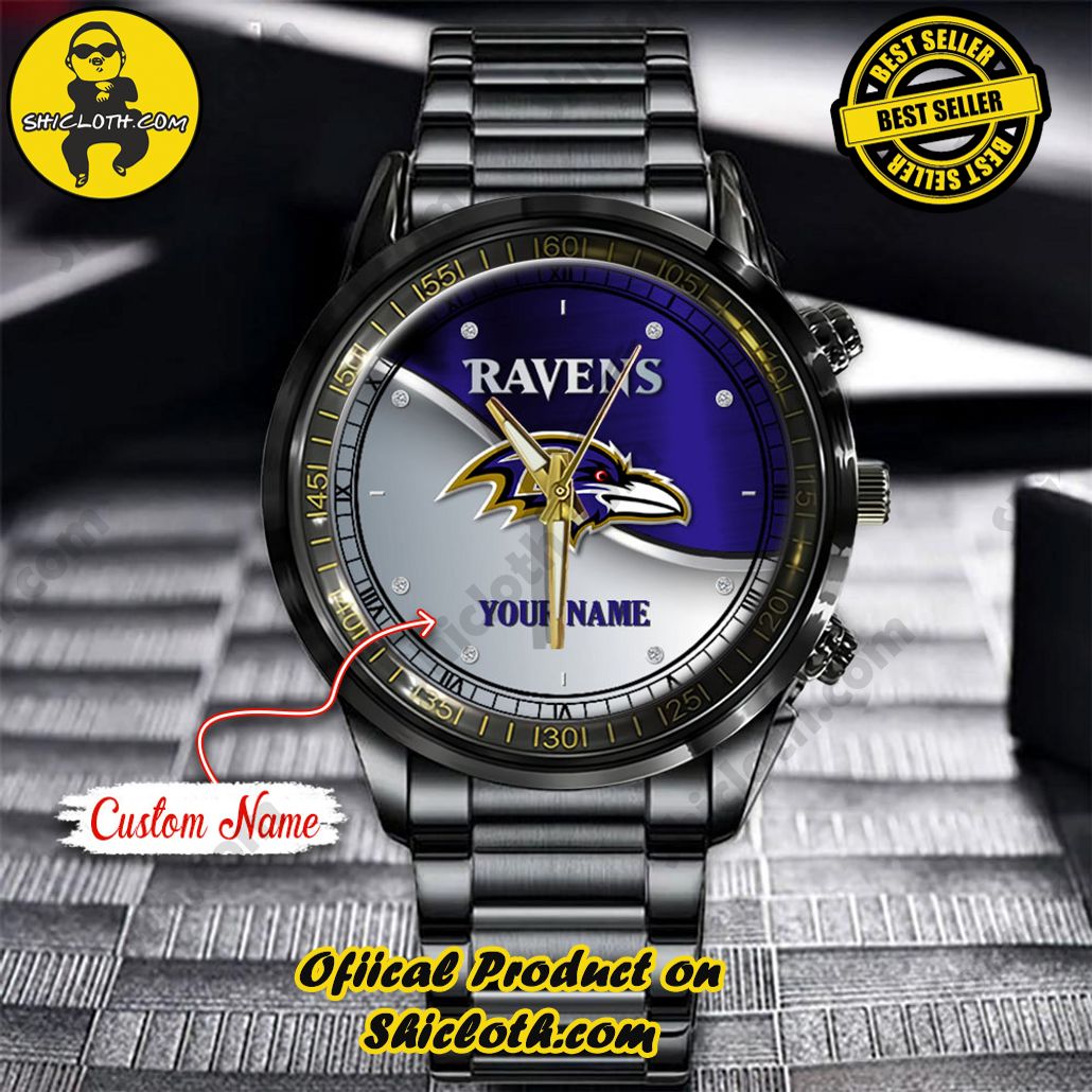 Introducing the NFL Baltimore Ravens Custom Name Stainless Steel Watch by Shicloth, a timeless accessory that combines sophistication, durability, and style in one sleek package.