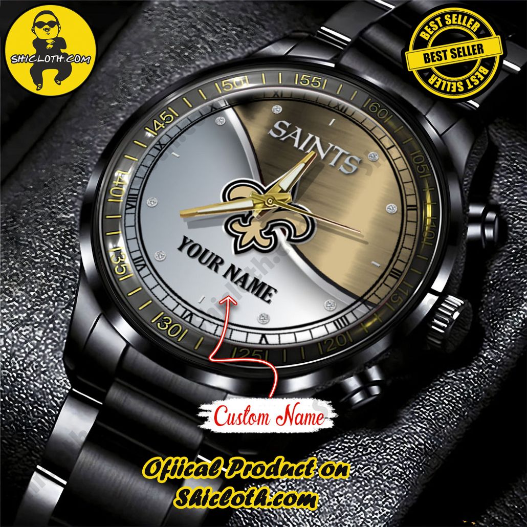 Introducing the NFL New Orleans Saints Custom Name Stainless Steel Watch by Shicloth, a timeless accessory that combines sophistication, durability, and style in one sleek package.