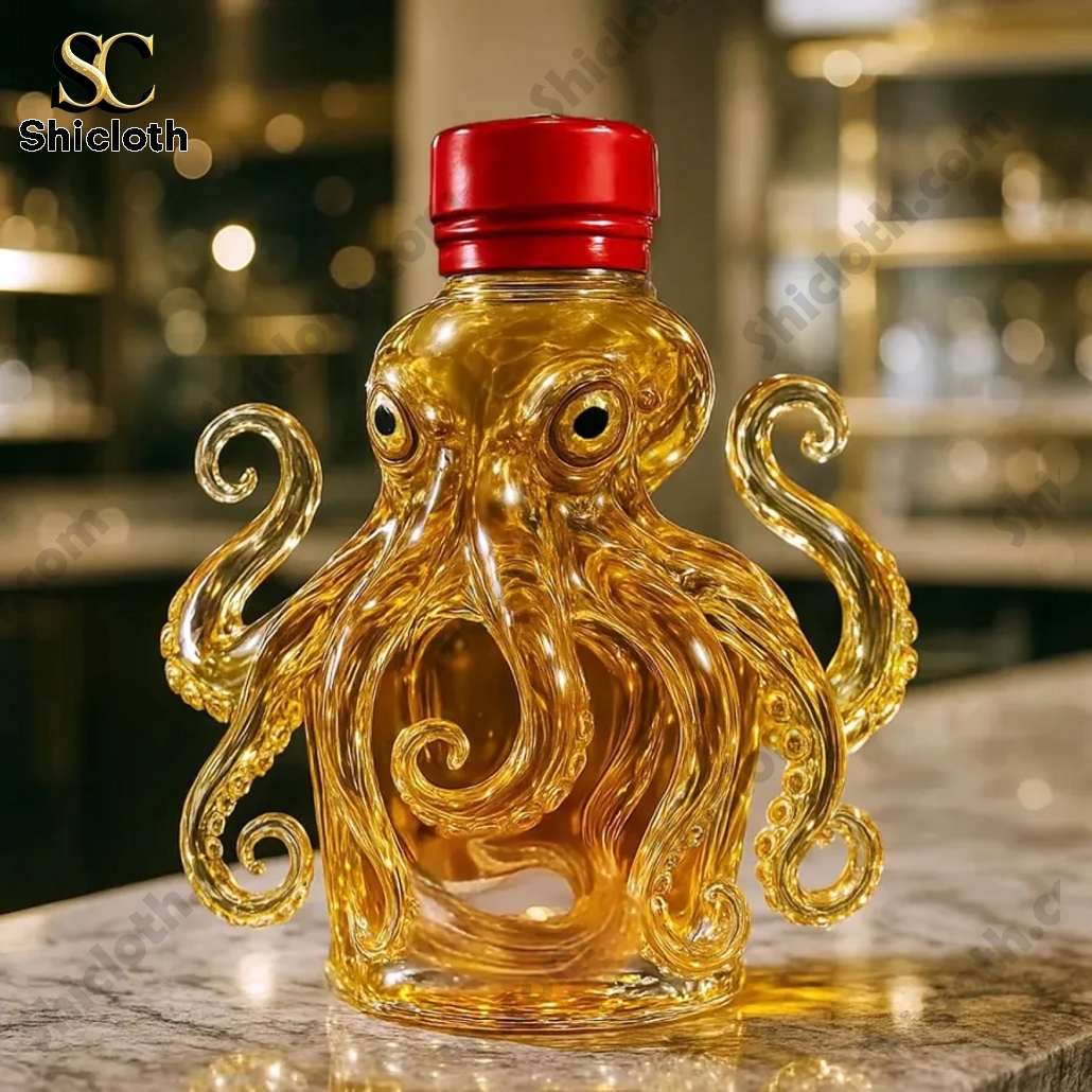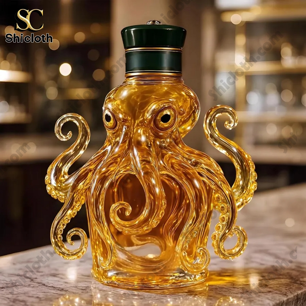 The bottle itself is made from high-quality amber-toned glass, sculpted into the shape of an octopus with eight swirling tentacles that serve as both decoration and grip. The glass is crystal-clear, allowing the golden hue of whiskey inside to shine. Its large, raised eyes give it a lifelike presence, while the tentacles wrap naturally around the bottle’s base. On top, each bottle features an airtight stopper that keeps the contents fresh and leak-free. Whether placed on a home bar, used in tastings, or gifted to a whiskey enthusiast, this bottle turns an everyday drink into an experience. The design not only protects the liquid but also adds a touch of ocean-themed luxury to any setting. It’s a bold piece that says just as much about your taste in design as it does about your drink.