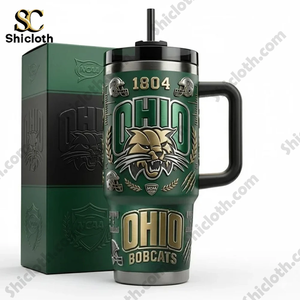 The tumbler features a deep hunter green finish with a sophisticated 3D-textured Bobcat mascot front and center. Above the logo, the founding year 1804 is proudly displayed in raised metallic lettering, flanked by miniature silver football helmets. The design includes a sturdy, ergonomic black handle and a clear, splash-resistant lid with a matching black straw. Every inch of the cup is detailed, from the “Ohio Bobcats” text at the base to the subtle scratch-mark motifs and wheat-ear accents that frame the central crest. Whether you are at a tailgate or in your living room, the premium inox stainless steel construction feels substantial in your hand and looks sharp next to your team gear.