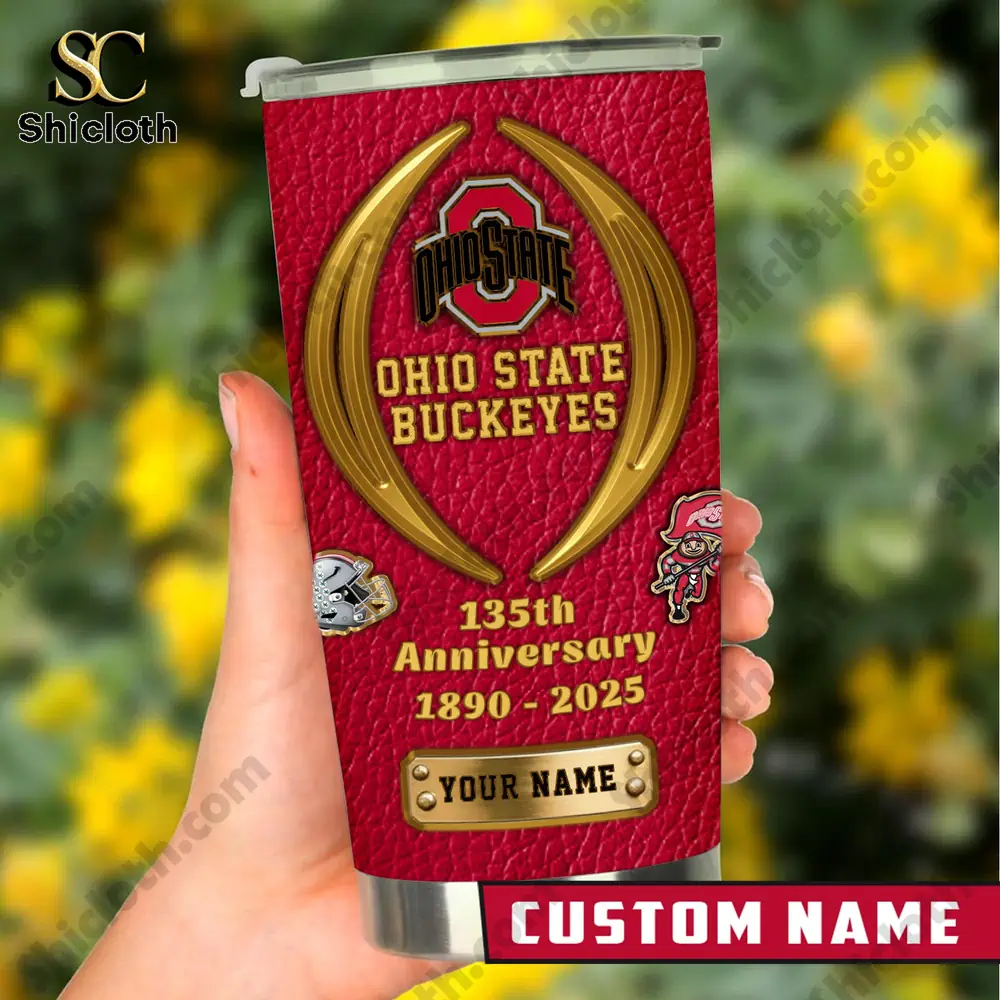 The Ohio State Buckeyes 135th Anniversary Custom Name Tumbler is the ultimate tribute for fans who want to combine team pride with everyday functionality. This striking tumbler features a rich red leather-texture print background that gives it a premium, rugged look. On the front, you will find the iconic Ohio State logo framed by golden horseshoes, alongside the “135th Anniversary 1800-2025” commemorative text. The design is packed with detail, including a 3D-style stadium graphic, Brutus Buckeye, and a silver helmet. What makes it truly special is the customizable gold-tone nameplate at the bottom, allowing you to add your own name for a personalized touch.