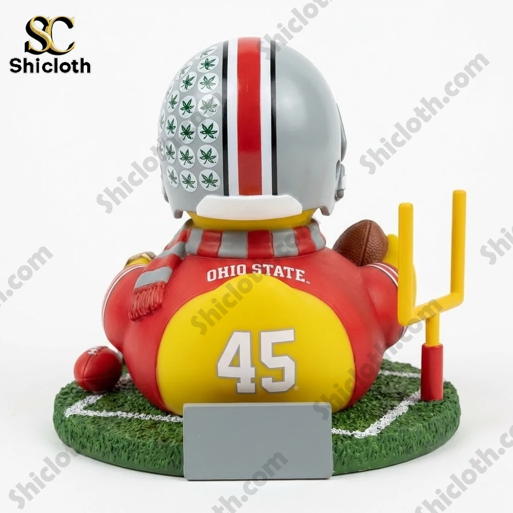 This collectible stands out thanks to its high-resolution UV printing and premium acrylic material, which gives the figure a sturdy 1.5cm thickness and a high-end feel. The duck is dressed in a classic red Ohio State jersey featuring the number 45 and is accessorized with a grey and red striped scarf. Every detail is carefully placed, from the brown textured football held in its wing to the miniature goalpost and beanie resting on the green turf base. The base itself is finished with a “Go Bucks” sign, ensuring the team spirit is visible from every angle.