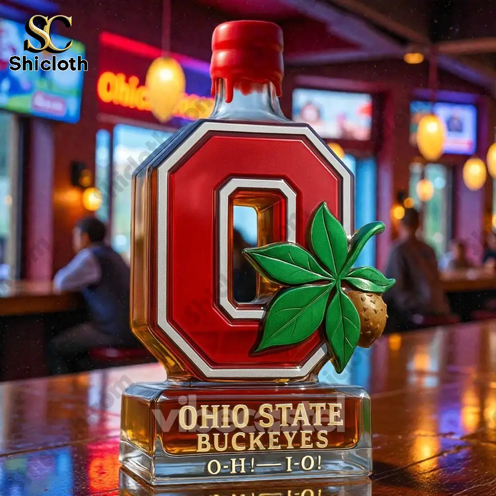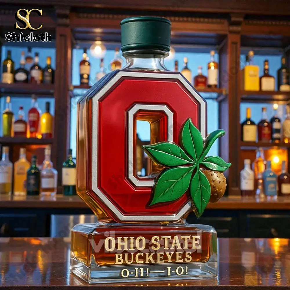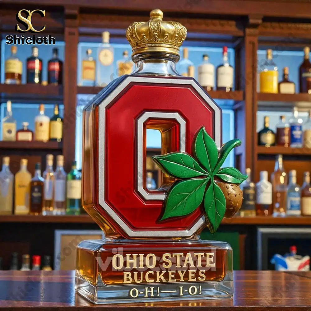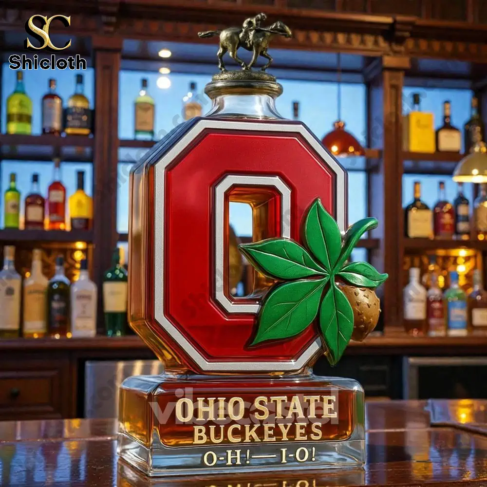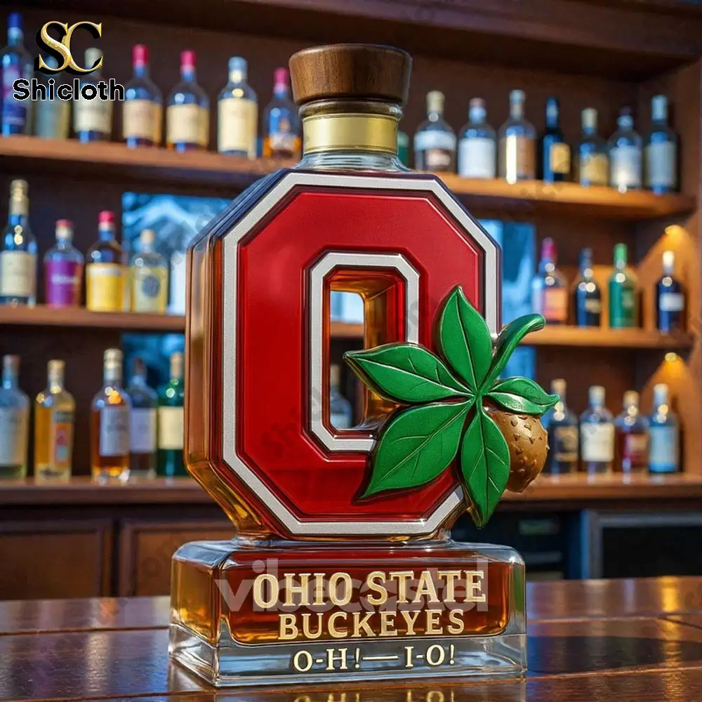 This is the Ohio State Buckeyes Limited Edition Whiskey Bottle, a spectacular piece of memorabilia that goes far beyond just a container. It’s an empty, collector’s quality decanter crafted from premium glass with a 350ml capacity (approx. 20 x 10 cm). The bottle itself is shaped like the iconic red and white Block ‘O’ logo, featuring a prominent green buckeye leaf and nut on the front. Engraved clearly on the solid glass base are the words “OHIO STATE BUCKEYES O-H-I-O!” This edition offers several distinct styles based on the bottle stopper, each giving it a unique flair—from the sophisticated Crown Royal-inspired crown stopper to the classic Jack Daniel’s-inspired black stopper, the rich Maker’s Mark-inspired red wax stopper, the equestrian-themed Blanton’s-inspired horse and jockey stopper, or the clean Jameson-inspired green stopper. Each detail, from the vibrant colors to the detailed buckeye charm, is precisely placed to honor your team.