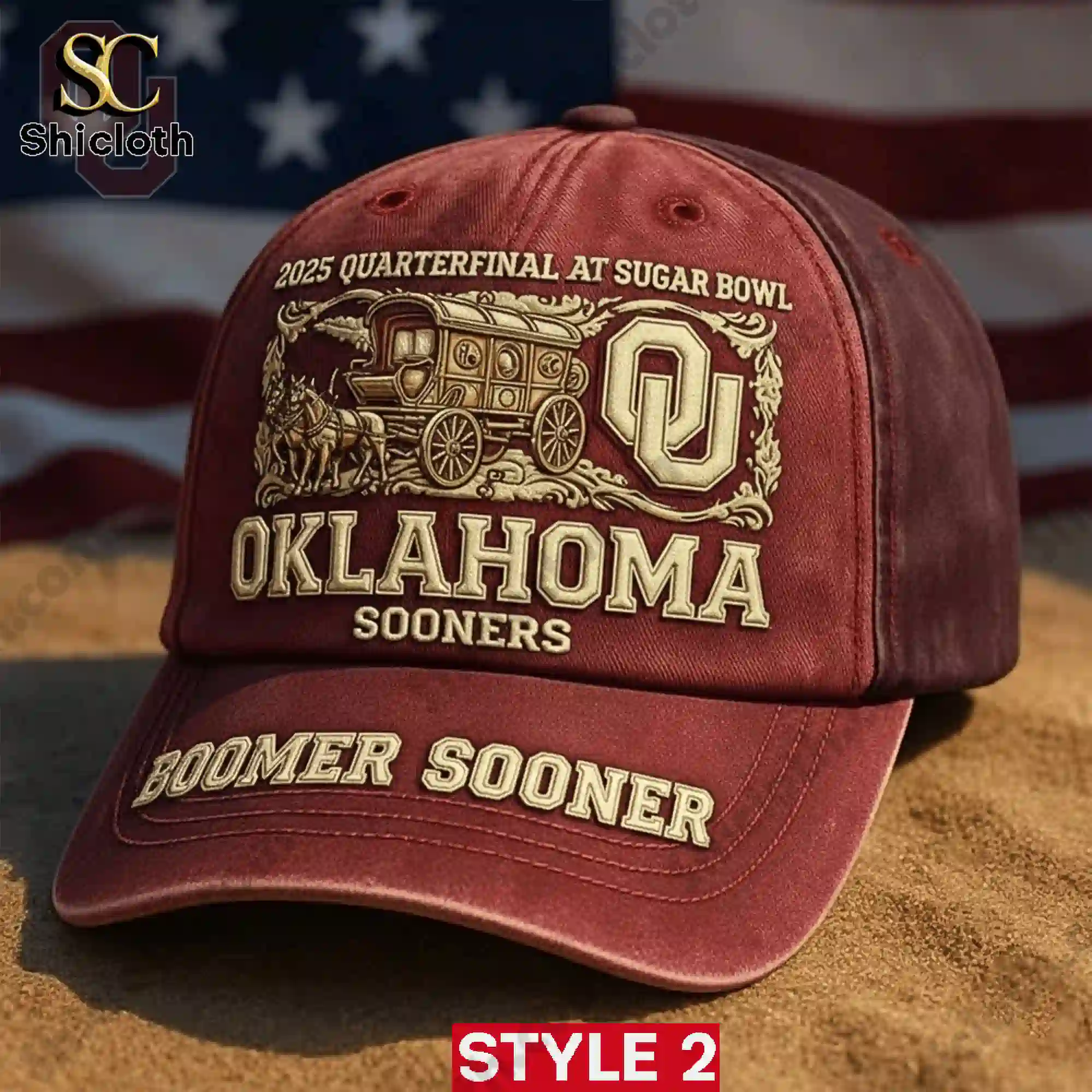 The collection offers four unique designs to suit any fan’s preference. Style 1 and Style 4 feature a trendy distressed aesthetic with “1895–2026” embroidered on the brim, celebrating the 131-year milestone. Style 1 showcases a solid crimson underlay beneath the tears, while Style 4 uses a striped pattern for added texture. Style 2 offers a vintage maroon wash with an intricate “2025 Quarterfinal at Sugar Bowl” graphic and a classic prairie schooner illustration. Style 3 stands out with a bold split-panel design (maroon and white) and unique safety pin accents on a distressed black brim.