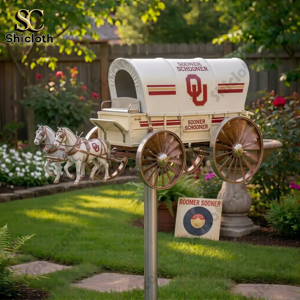 This spinner is available in two distinct versions to suit your personal garden style. Style 1 offers a robust, rustic wooden aesthetic, featuring a large canvas-style cover printed with the bold “Oklahoma Sooners” and “Sooner Schooner” text alongside the classic crimson OU logo. Style 2 provides a more intricate, mechanical look, including hand-painted white horses in mid-stride and a sleek cream-colored wagon body accented by crimson racing stripes. Every model includes a functional directional compass at the base with North, South, East, and West indicators, and a high-quality bearing system that allows the multi-spoke wooden-style wheels to spin independently as the wind passes through.