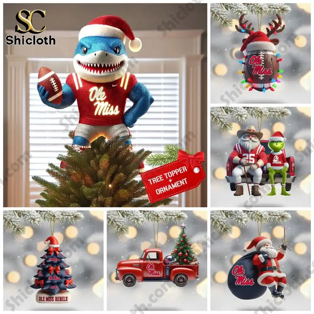Are you ready to bring your Ole Miss Rebels pride to your Christmas tree this year? The 2025 Tree Topper and 10 Ornament Set is the ultimate way for any devoted fan to celebrate the holidays. This set isn’t just a collection of decorations; it’s a complete display of school spirit featuring the iconic Ole Miss logo and colors (navy, red, and white) across a variety of fun, festive, and football-themed designs. You’ll find ornaments showcasing Ole Miss Santa figures, a themed Christmas tree, a football-shaped reindeer, a vintage pickup truck, and even the Rebel Shark mascot wearing a Santa hat and holding a football—which also serves as the impressive tree topper.