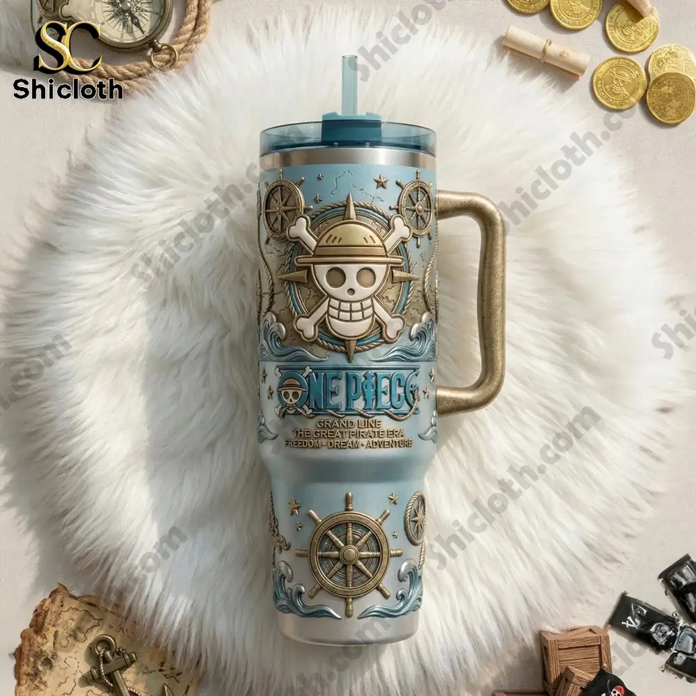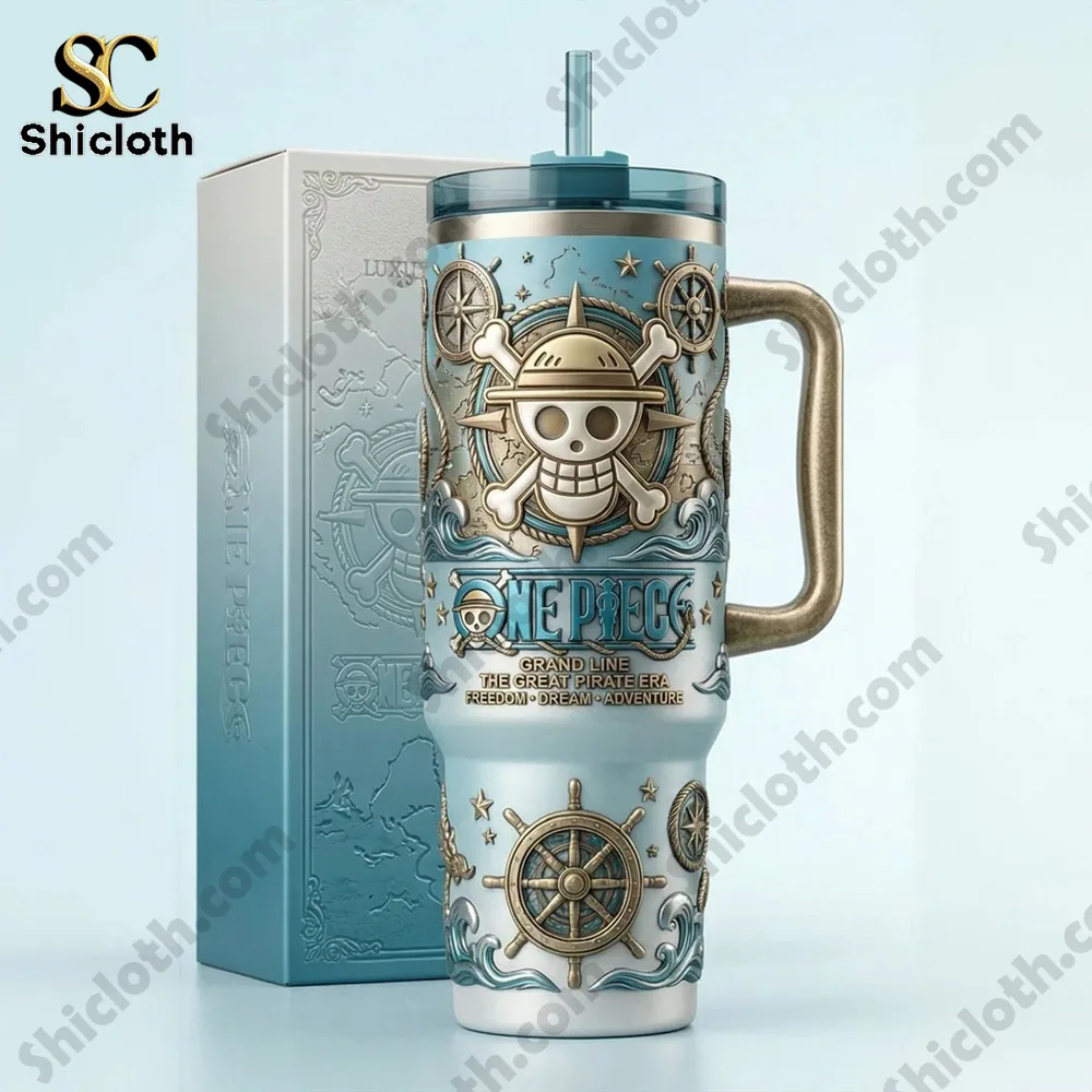 The One Piece Grand Line The Great Pirate Era Freedom Tumbler Cup is the ultimate companion for fans of the legendary series. Designed with a stunning sky blue gradient and 3D-effect pirate motifs, this high-quality inox stainless steel tumbler combines artistic craftsmanship with practical utility, keeping your favorite drinks at the perfect temperature during any adventure.