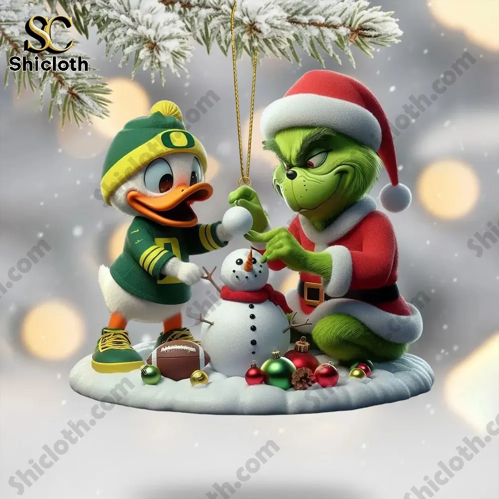 Looking for a unique way to celebrate Christmas while cheering for the Ducks? This set is specifically designed for you! Whether you’re a student, an alumnus, or just a massive fan, these decorations offer a natural and fun conversation starter during the holidays. The playful, detailed artwork—like the Duck and the Grinch helping each other build a snowman or putting the star on the tree—brings a cheerful and engaging feel to your home. The color scheme is predominantly the classic Oregon green and yellow, with festive pops of red and white, ensuring they stand out beautifully against your holiday greenery. Plus, because they are made of acrylic, they are easy to handle and maintain, requiring only a gentle wipe to keep them looking pristine.