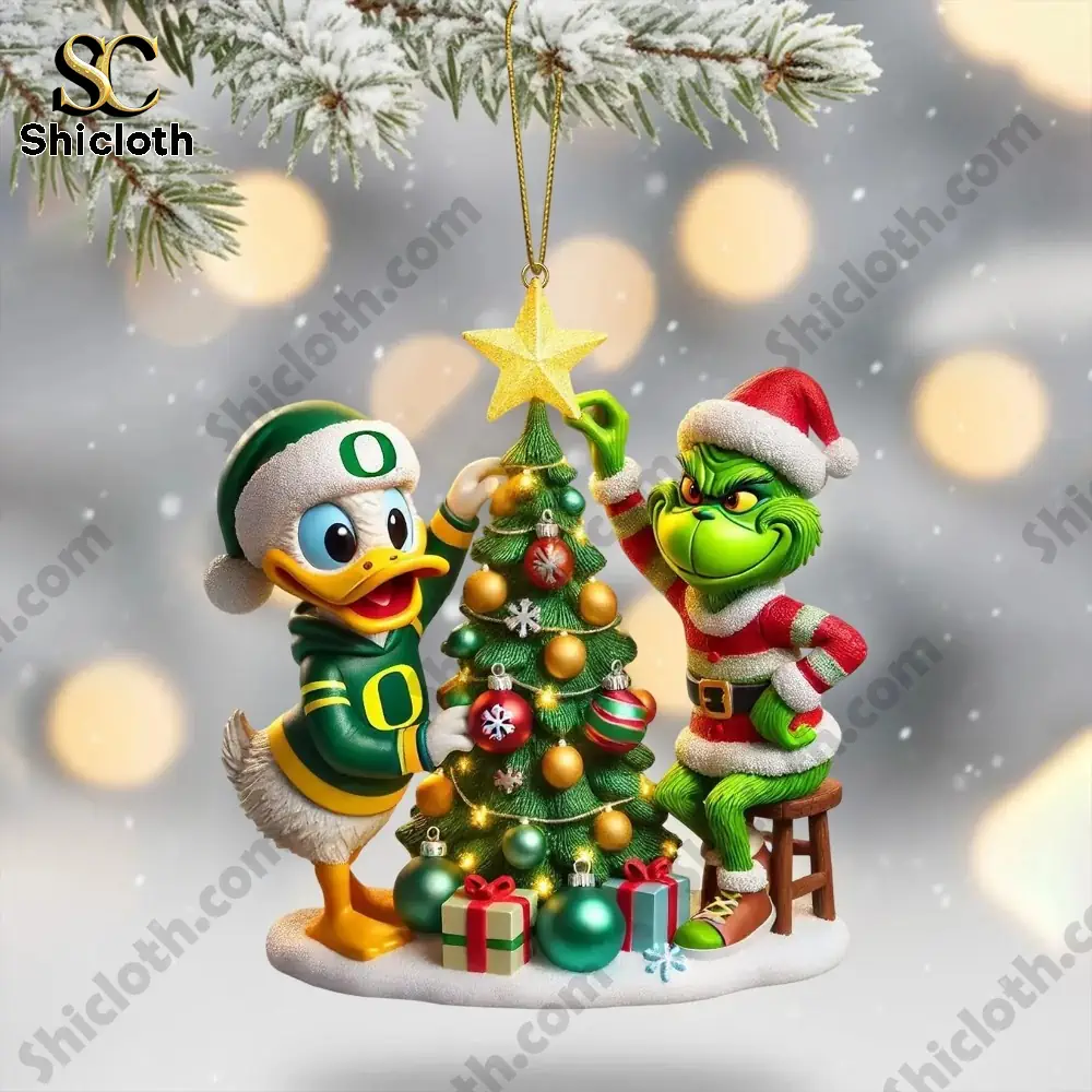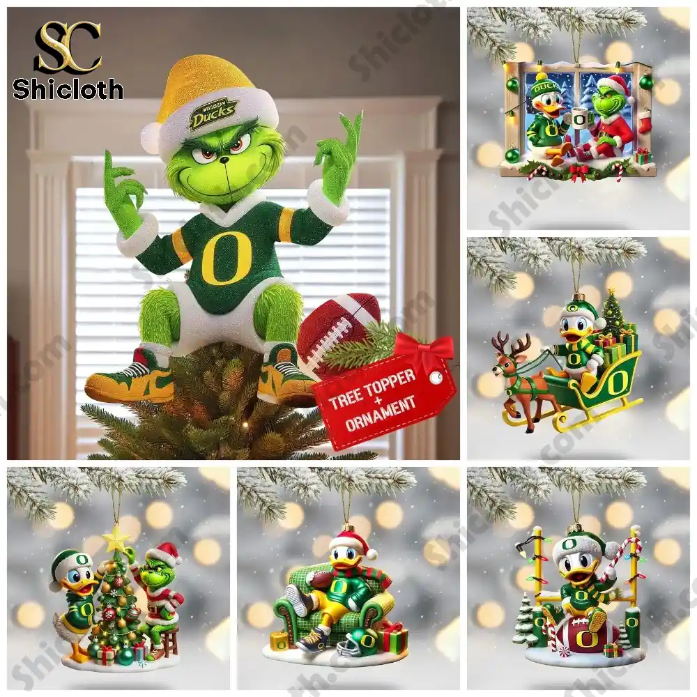 This collection is the perfect way for any dedicated Oregon Ducks fan to showcase their team pride and holiday spirit! It’s a complete set featuring a tree topper and multiple ornaments, bringing a festive, sporty, and fun theme to your Christmas tree. The designs brilliantly combine the iconic University of Oregon colors—green and yellow—with beloved characters like the Oregon Duck mascot and even the Grinch, all in a charming, collectible style.