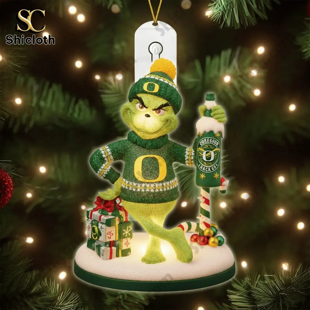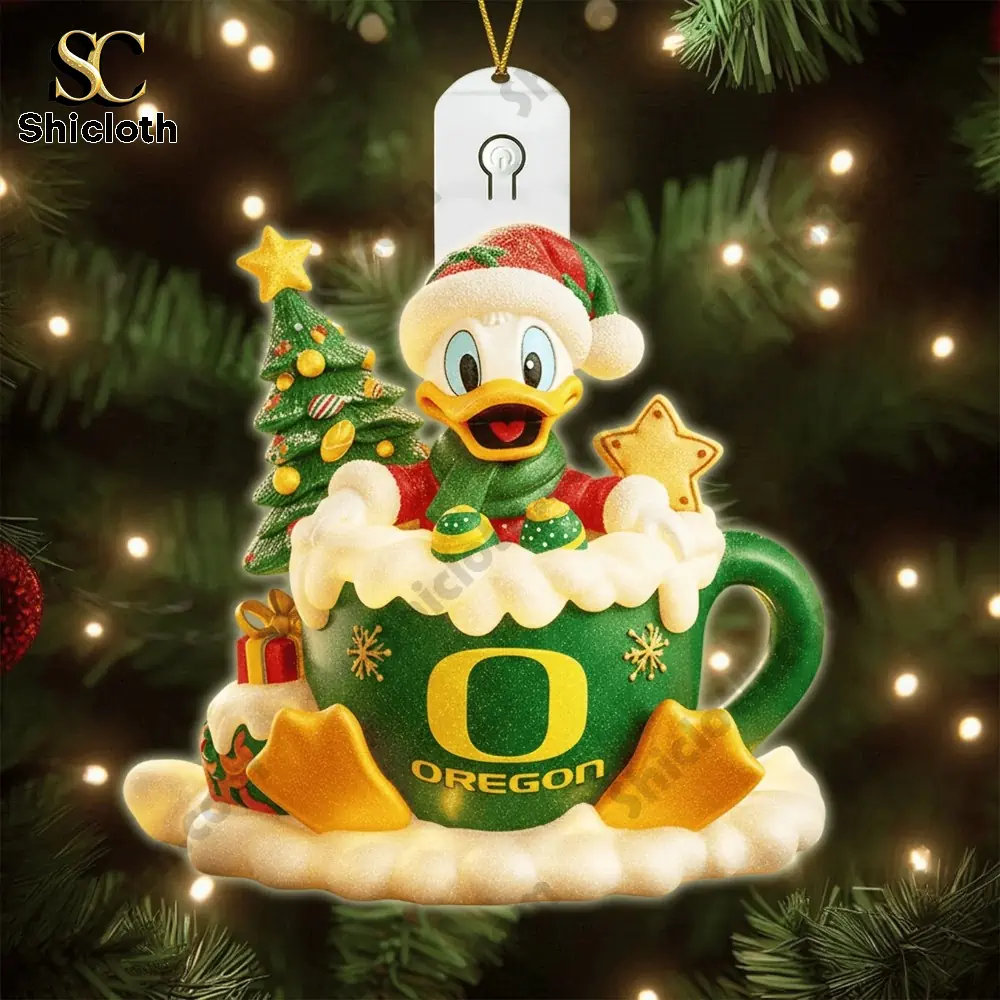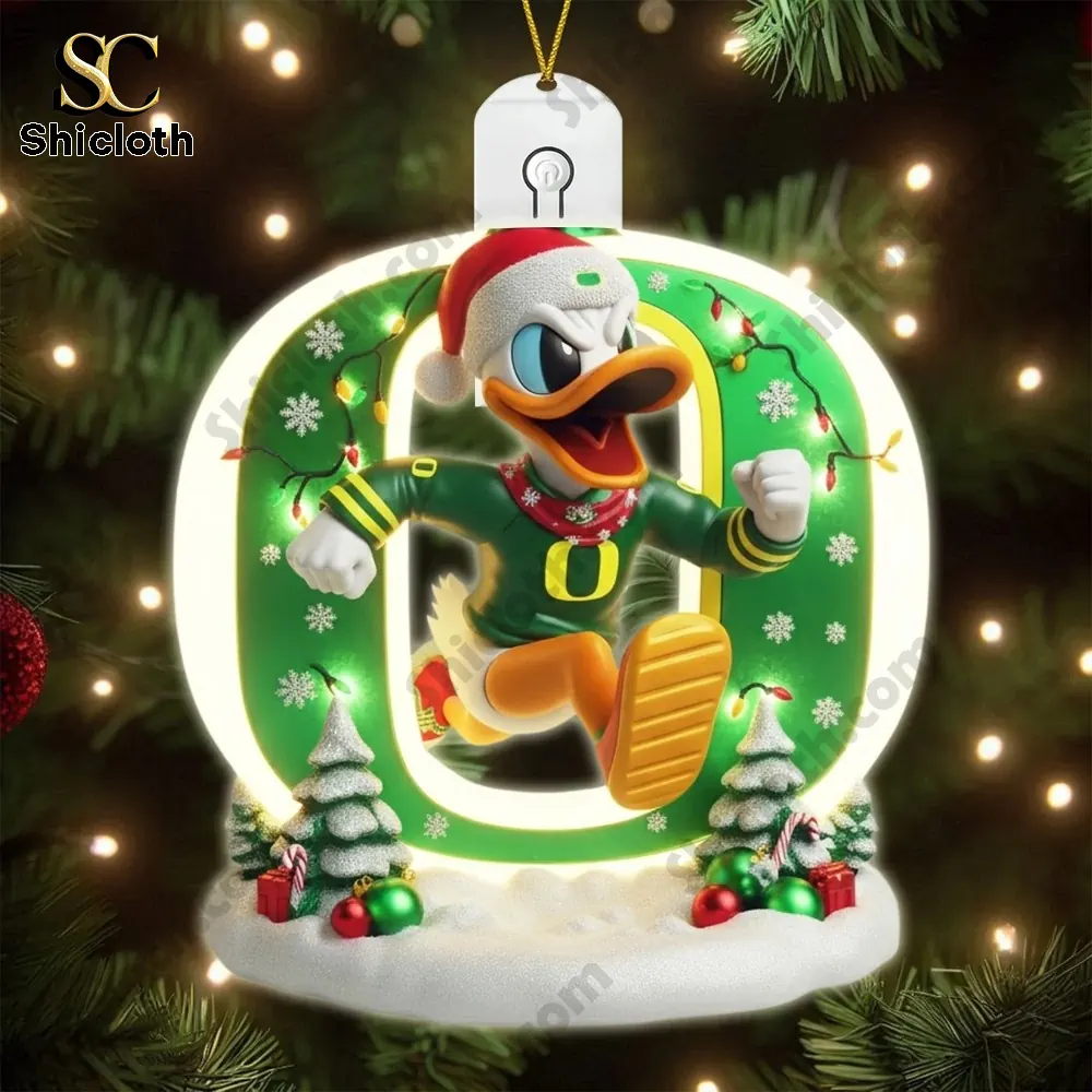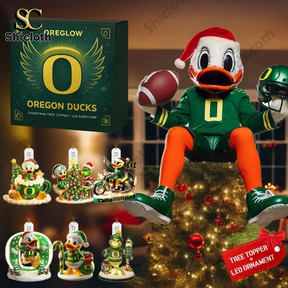 These photos showcase the Oregon Ducks Christmas Tree Topper and 6 LED Ornament Gift Set 2025, a must-have for any University of Oregon fan looking to bring team spirit to their holiday decorations. The collection features both the iconic Oregon Ducks mascot, Donald Duck, and a festive Grinch character, all dressed in the school’s signature green and yellow. Each ornament is brightly colored, meticulously detailed, and includes a special LED light feature for a truly dazzling display. This set combines team pride with holiday cheer, making it the perfect collector’s item and gift for the 2025 season.