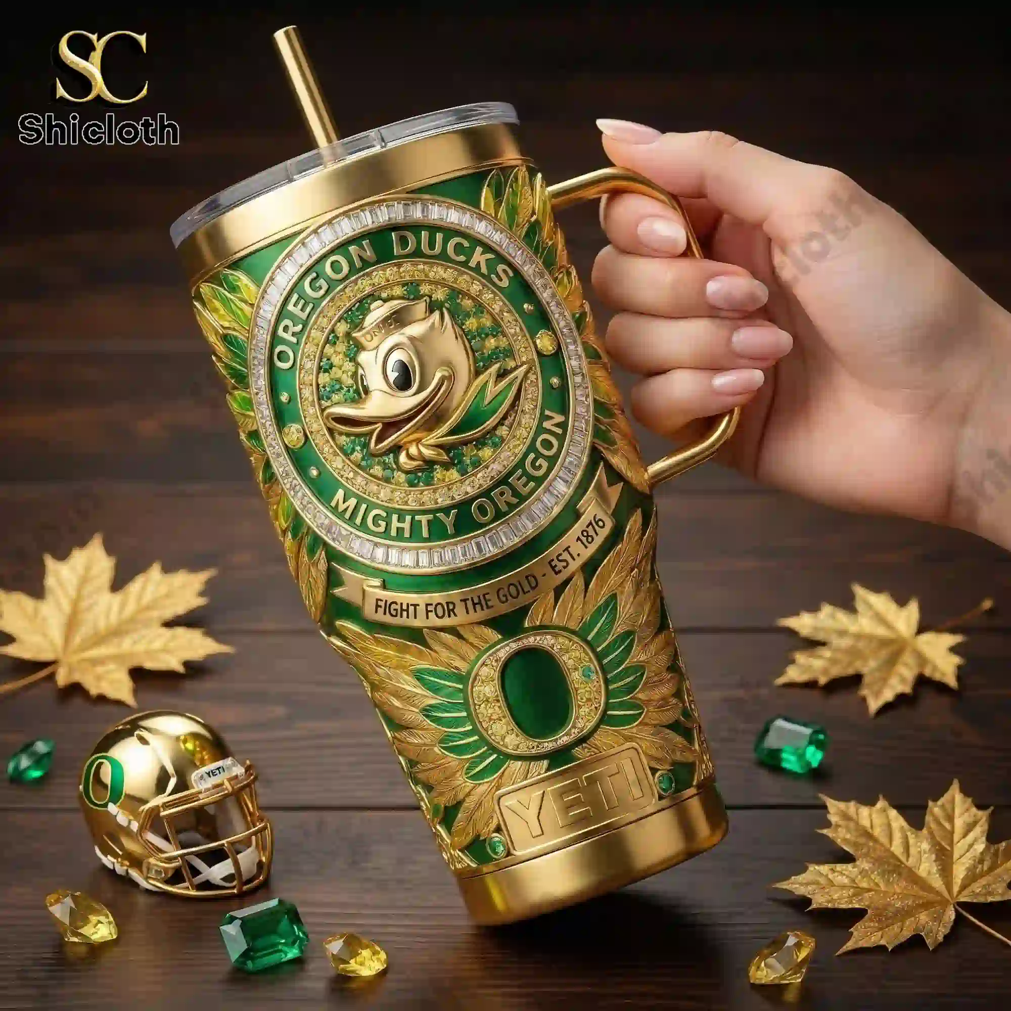 The Oregon Ducks Mighty Oregon Fight For The Gold Tumbler is the ultimate statement piece for fans who want to combine their team spirit with a touch of luxury. This premium tumbler features an incredibly detailed design, blending a vibrant forest green base with high-shine gold accents and intricate “jeweled” textures that mimic emeralds and diamonds. Whether you are at Autzen Stadium or hosting a backyard BBQ, this vessel is built to keep your drinks at the perfect temperature while showcasing your loyalty to the Ducks.