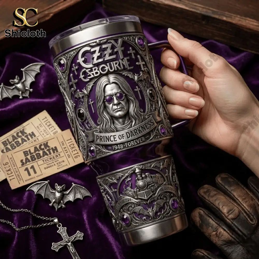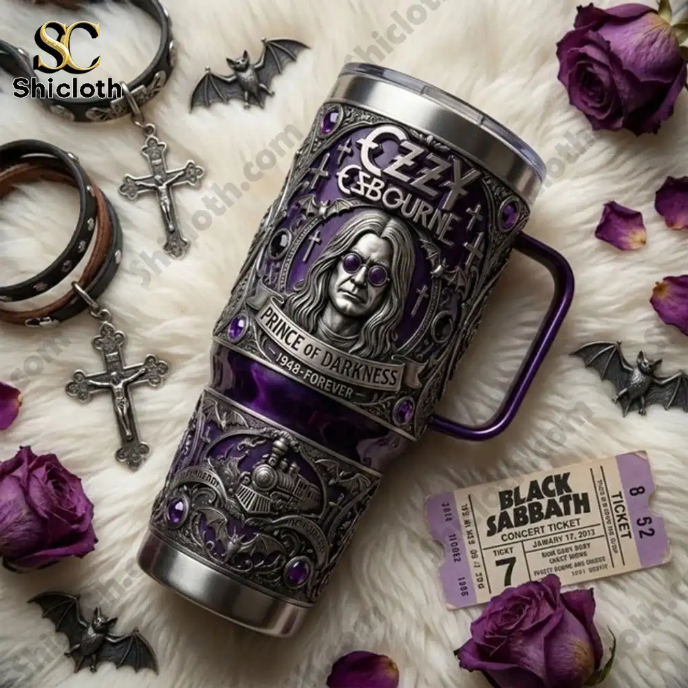 This Ozzy Osbourne “Prince of Darkness” Tumbler is the ultimate tribute for metal fans who want to combine their love for the rock legend with a premium, functional drinkware piece. Featuring a stunning 3D-effect design, this tumbler showcases a detailed portrait of Ozzy in his signature round purple glasses, framed by Gothic elements and the iconic “Prince of Darkness” banner.