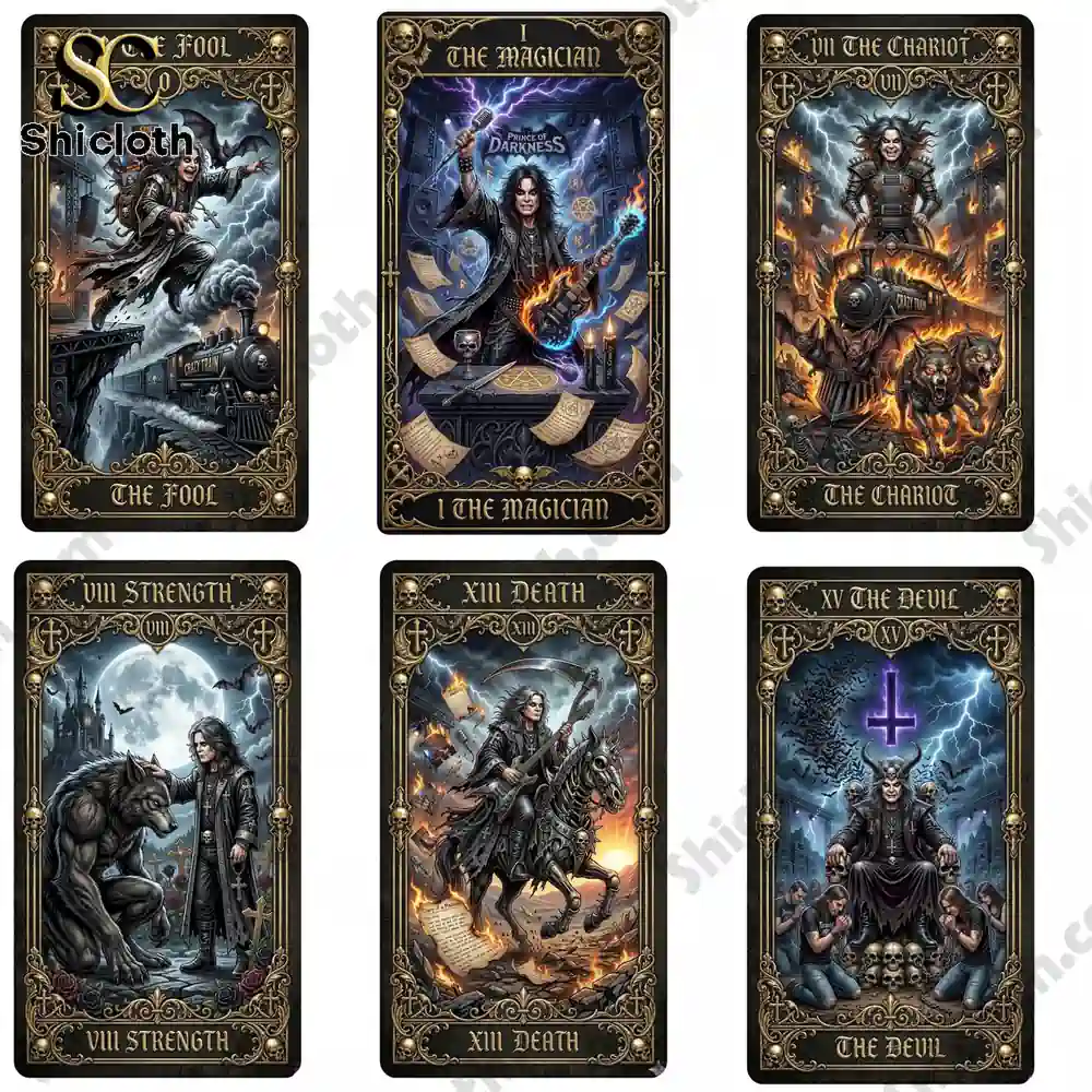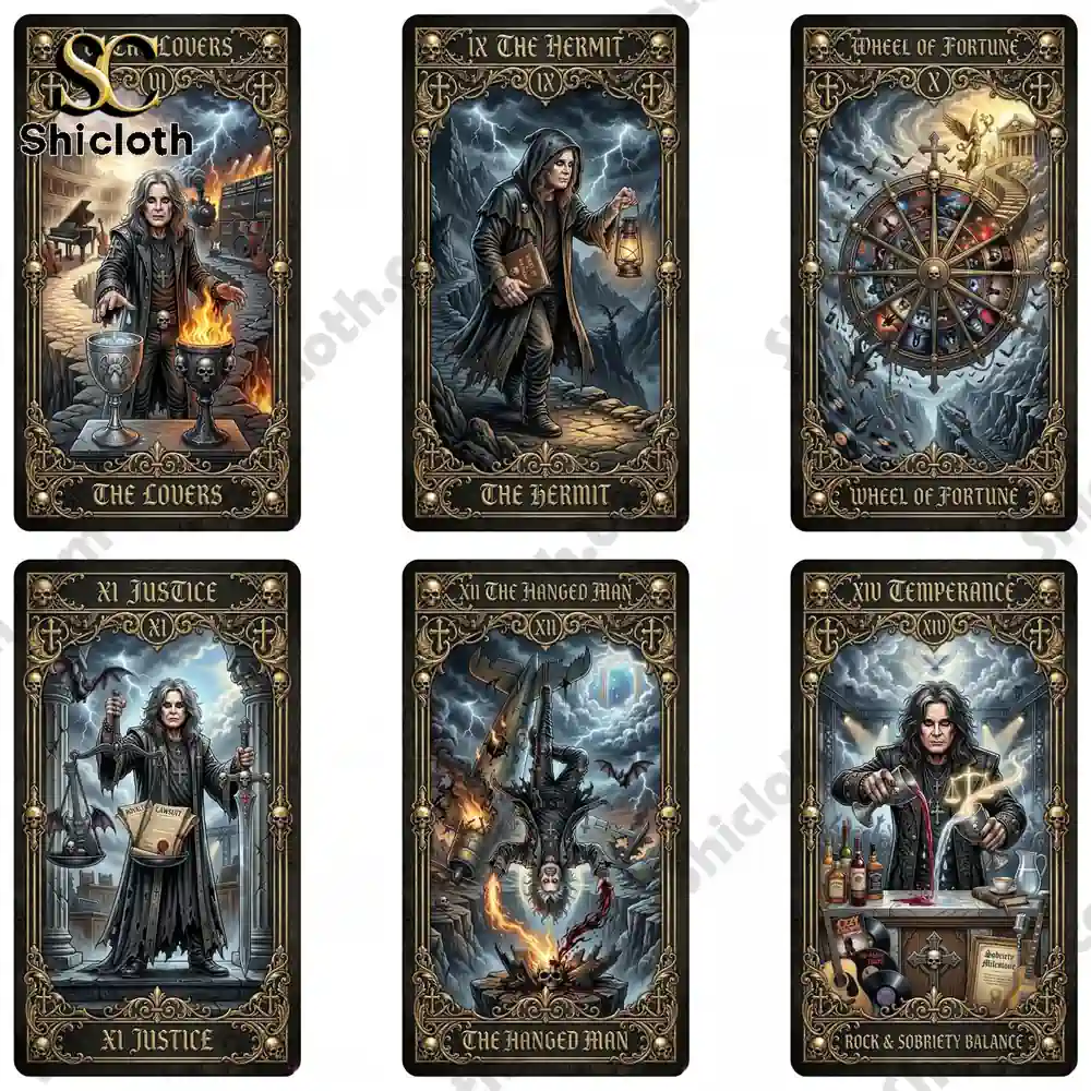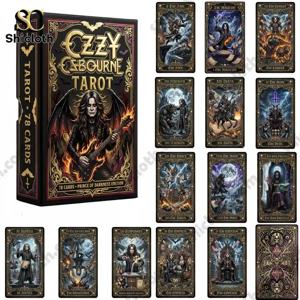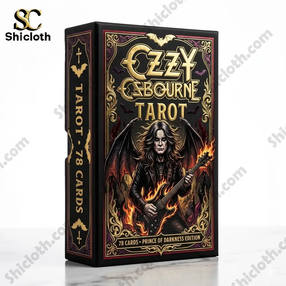 If you are a fan of heavy metal seeking a spiritual connection with a rock legend, the Ozzy Osbourne Tarot – Prince of Darkness Edition is the perfect deck to bridge your love for music and the mystical. This collector’s set features 78 cards that transform the traditional Rider-Waite-Smith imagery into a gothic, rock-and-roll odyssey. Each card is a miniature masterpiece, depicting Ozzy in various iconic personas—from the leaping wanderer on The Fool card standing atop a “Crazy Train” to the powerful, winged figure on the box cover. The aesthetic is dark and sophisticated, utilizing a palette of deep charcoal, burnished gold, and vibrant purple lightning to create a truly atmospheric reading experience.