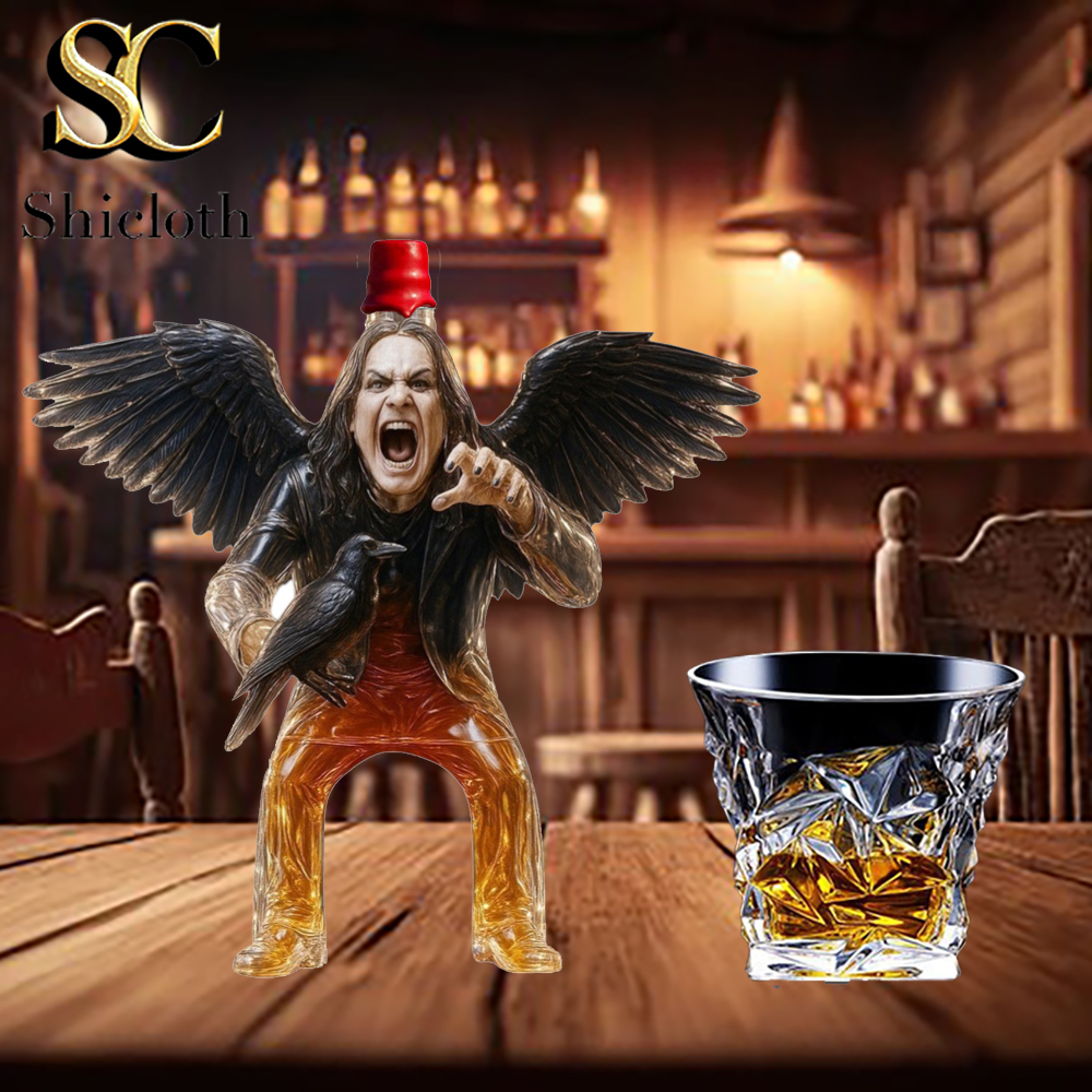 This striking bottle is made from high-quality glass and sculpted into a fully detailed figure of Ozzy Osbourne, complete with black wings spread wide, a fierce scream expression, and a perched crow on his arm — a nod to his legendary persona. The glass base forms Ozzy’s lower body and stores your favorite drink, visible through the translucent amber “legs,” giving the illusion of flowing whiskey. Each edition includes a matching premium glass tumbler, adding both utility and class. Compact at 20×10cm but loaded with character, it’s ideal for whiskey, wine, or any spirit of your choice. Just remember: it ships empty, ready for your own rebel blend.