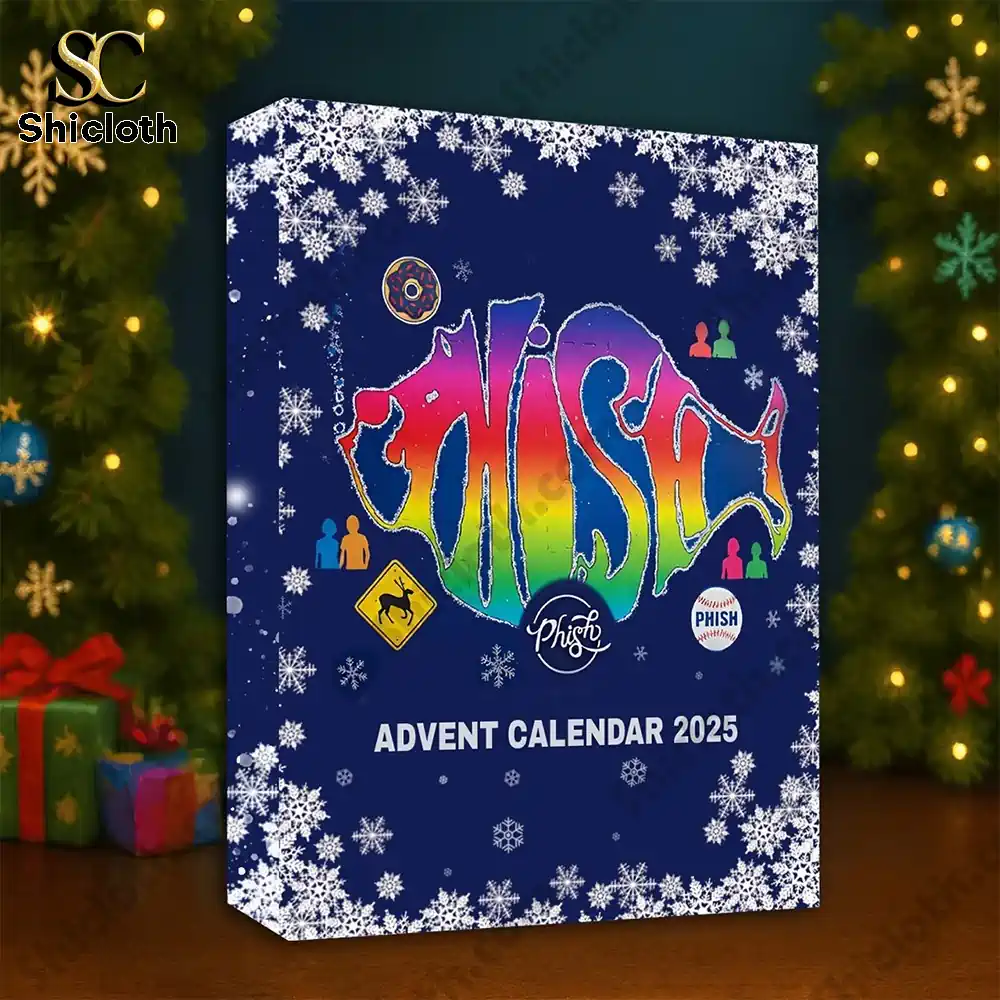 Unveil a new dose of jam-band magic every day with the Phish Christmas Advent Calendar 2025! This isn’t your grandma’s countdown—it’s a deep-cut celebration for the devoted “Phan.” The calendar itself is a stunner, set in a deep, cosmic blue box framed by a flurry of crisp white snowflakes. Dominating the front is the iconic Phish logo, rendered in a striking, psychedelic rainbow gradient that perfectly captures the band’s improvisational spirit and legendary light shows. Below the main logo, the text “ADVENT CALENDAR 2025” sits prominently, alongside recognizable small icons from the Phish universe, like the ‘Donut’ logo and the Gamehendge deer crossing sign.