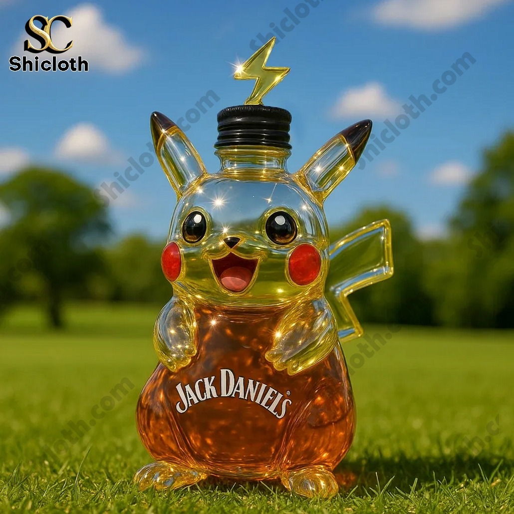 This bottle is crafted from high-quality glass material that is crystal clear, allowing the rich amber hues of your whiskey to shine through Pikachu’s body. The design features the iconic character in a joyful pose, complete with bright red cheeks and a jagged lightning bolt tail. The most unique part is the variety of specialized stoppers. You can choose the elegant golden crown stopper for the Crown Royal edition, a sleek black cap for the Jack Daniel’s version, or even a stopper with a horse and rider for the Blanton’s style. Each bottle features the brand logo printed clearly across Pikachu’s belly, creating a perfect fusion of pop culture and premium spirits.