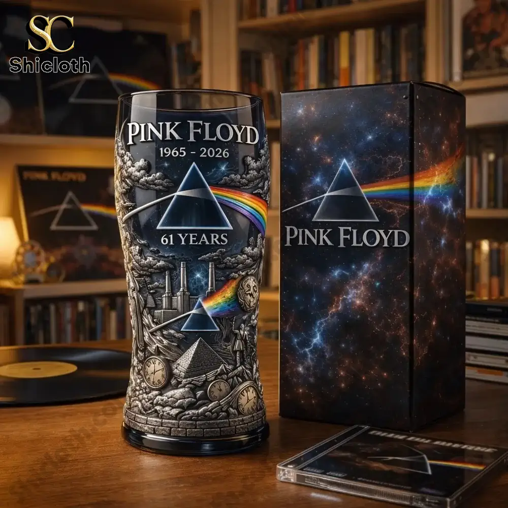 The Pink Floyd 1965–2026 61st Anniversary 3D Relief Pint Glass is a premium commemorative piece designed for fans who want to celebrate over six decades of psychedelic rock history. This high-quality glass features an intricate 3D embossed relief that brings iconic album imagery to life, including the Dark Side of the Moon prism, the Battersea Power Station from Animals, and the pyramids of Egypt. Crafted from heavy-duty, lead-free glass, it offers a substantial feel in the hand and a crystal-clear finish that showcases the vibrant rainbow light rays and cosmic nebula backdrop.
