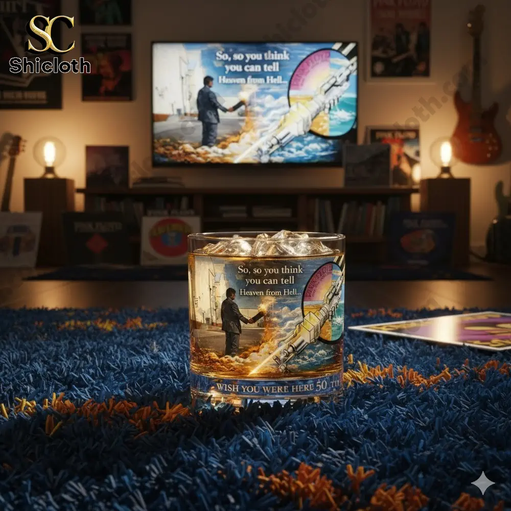The Pink Floyd Wish You Were Here 50th Anniversary Whisky Glass is a premium tribute to rock history, blending functional artistry with iconic imagery. Featuring high-quality dye-sublimation printing, this 11-15oz glass showcases the legendary burning man handshake against a backdrop of industrial architecture and blue skies. The design is meticulously detailed, including the classic mechanical handshake logo and the poignant lyrics “So, so you think you can tell Heaven from Hell…” scripted elegantly across the center. Along the base, the text “WISH YOU WERE HERE 50 TH” is prominently displayed, making it a definitive commemorative piece for collectors and music enthusiasts.