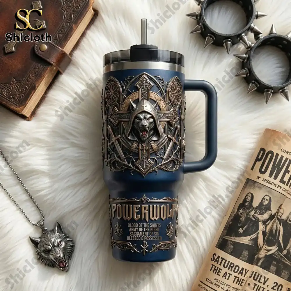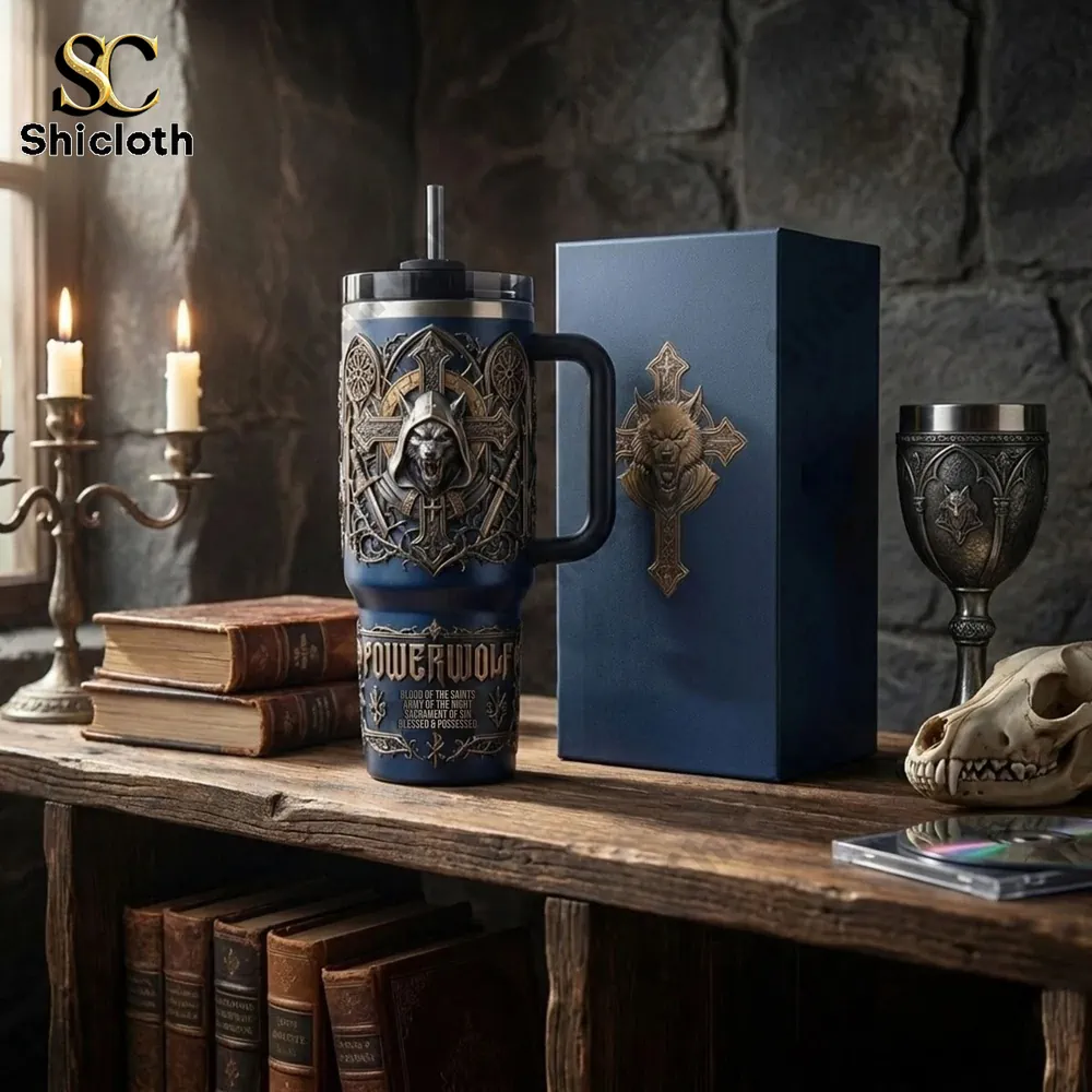 The Powerwolf Blood Of The Saints Tumbler Cup is a premium piece of drinkware designed for fans of heavy metal aesthetics and high-performance insulation. This set features a deep navy blue finish adorned with intricate, raised 3D gothic carvings, including a hooded wolf centerpiece and crossed swords. Whether you are looking for a reliable travel companion for outdoor adventures or a bold statement piece for your home collection, this tumbler combines dark fantasy art with practical durability.