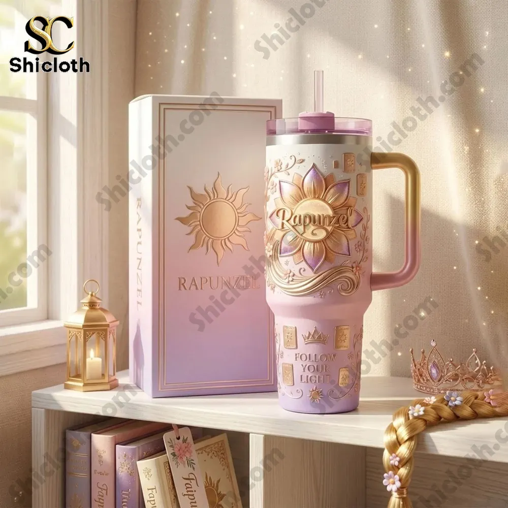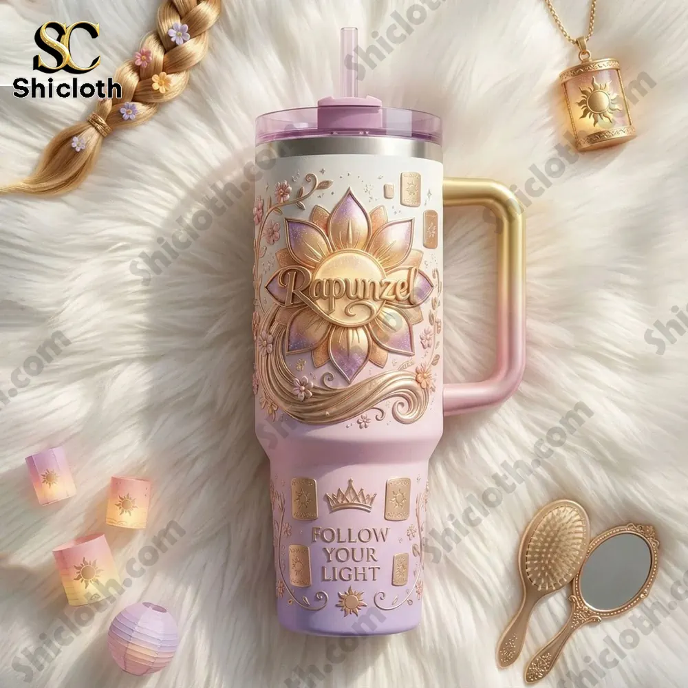 The Rapunzel Follow Your Light Tumbler is a dream come true for fans of the lost princess, blending a magical aesthetic with high-performance hydration features. This stunning 40oz vessel is designed with a soft pink and lilac gradient finish, adorned with 3D-embossed golden sun motifs and the inspiring “Follow Your Light” inscription. Whether you are gifting it to a Disney lover or treating yourself, this tumbler serves as a functional piece of art that keeps your favorite beverages at the perfect temperature all day long.