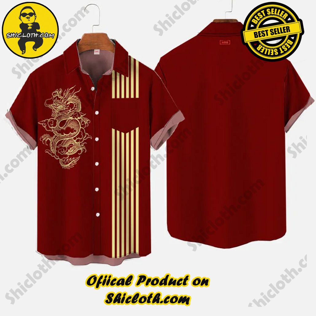 - Suitable for special occasions such as Christmas, birthday, celebration, housewarming gift. Retro 50s Red And Yellow Stitching Stripes And Dragon Totem Printing Breast Pocket Short Sleeve Shirt