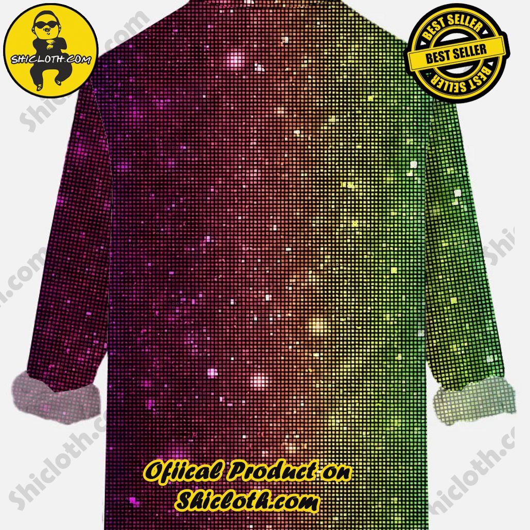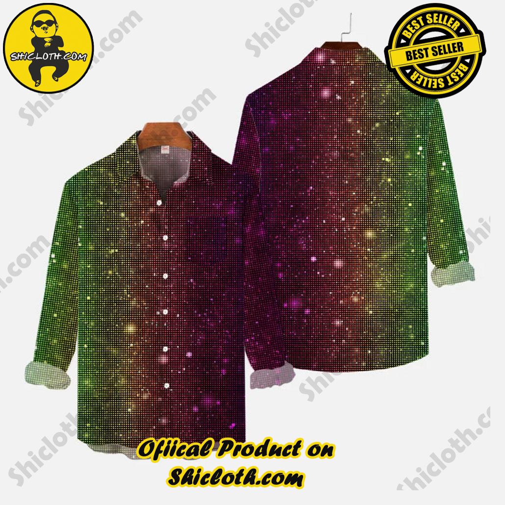 Overview of the Retro 70s Disco Colorful Gradient Mosaic Glitter Printing Breast Pocket Long Sleeve Shirt: