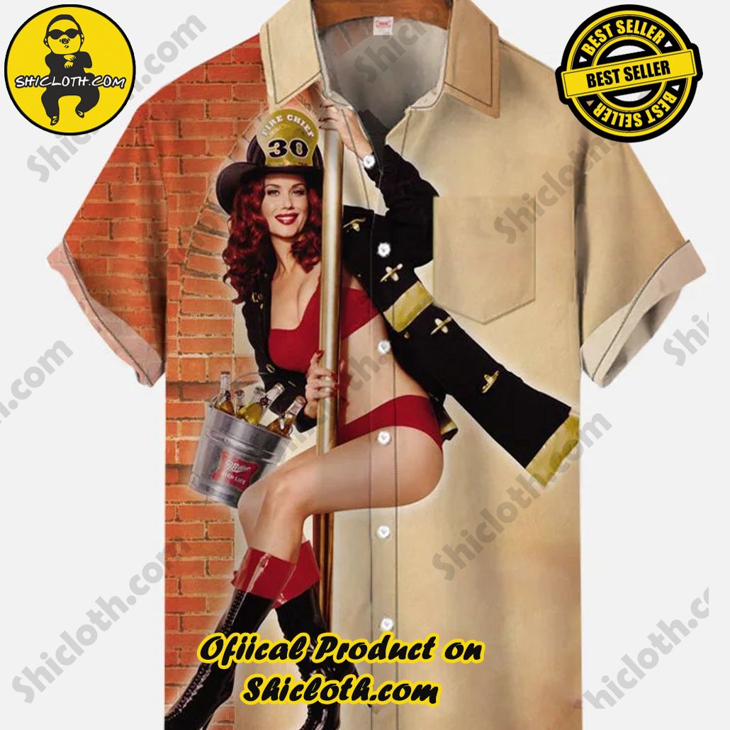 Retro Beautiful Dancing Beer Girl Printing Breast Pocket Short Sleeve Shirt